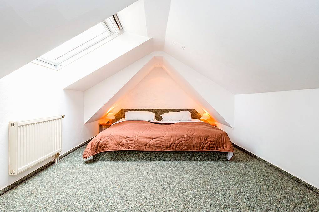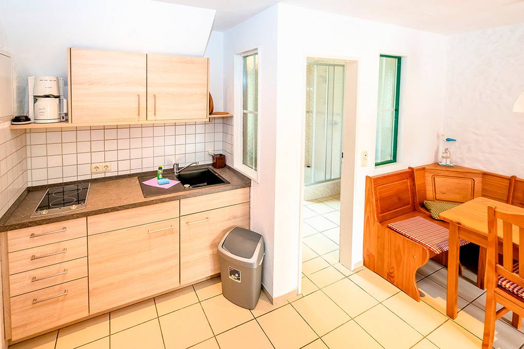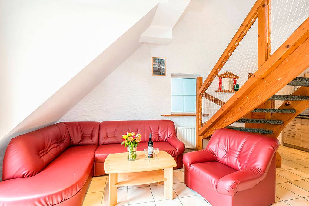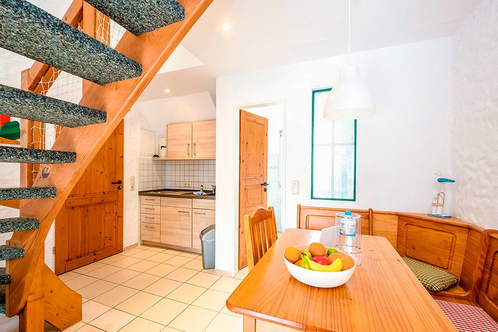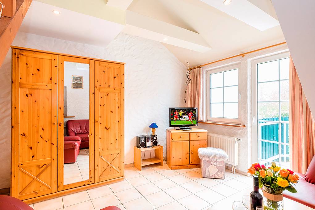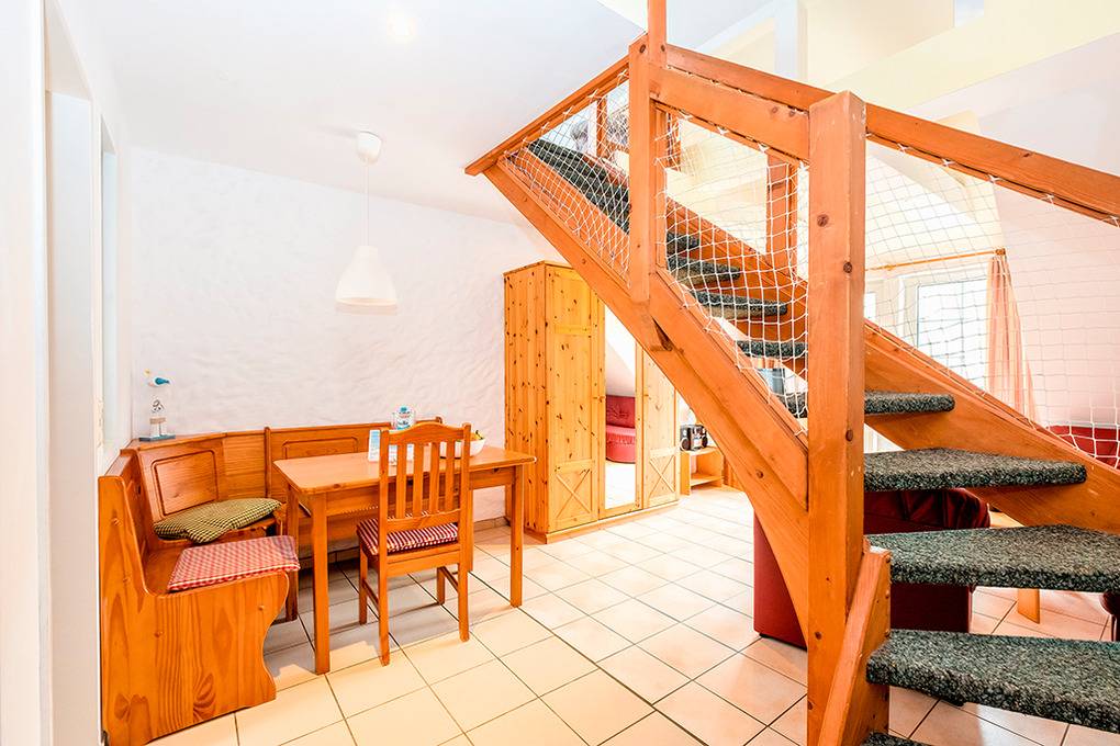 D 66.17 Wohnung 1-3 Pers.: 2-Zimmer-Maisonettewohnung, 40 qm Wohnfläche über 2 Etagen. 1. Etage: Wohn-/Essraum mit Couchgarnitur, Esstisch, Küchenzeile (2-Platten-Ceranfeld). Bad/WC. Treppe in den offenen Spitzboden mit starken Dachschrägen (max. Stehhöhe 1,70 m): Doppelbett, Einzelbett. Große Dachterrasse (gemeinschaftliche Nutzung mit den Fewos D 66.17A und D 66.19A).