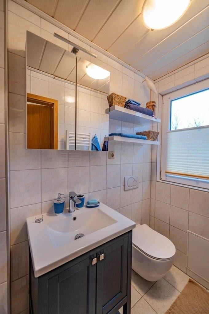 Die Wöhnung verfügt außerdem über ein Bad mit WC, Duschkabine, Waschbecken, Spiegel und Fön.