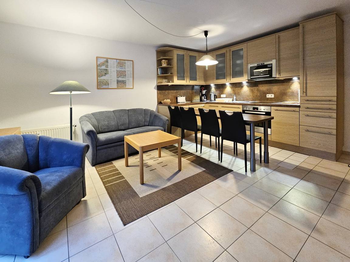 Die Ferienwohnung im 1. OG besteht aus einem Raum mit Wohn- und Küchenbereich mit Esstisch und kleiner Pantryküche, sowie einem Schlafbereich mit Doppelbett.