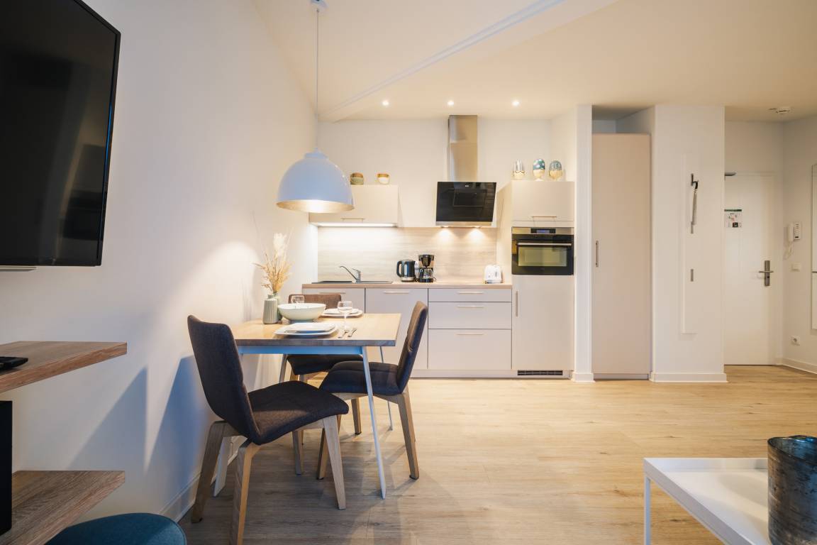 Die voll ausgestattete Küche verfügt über Backofen, Cerankochfeld, Geschirrspüler, Kaffeemaschine, Wasserkocher, Toaster u.v.m. und ermöglicht eine unkomplizierte Selbstversorgung während Ihres Aufenthalts.