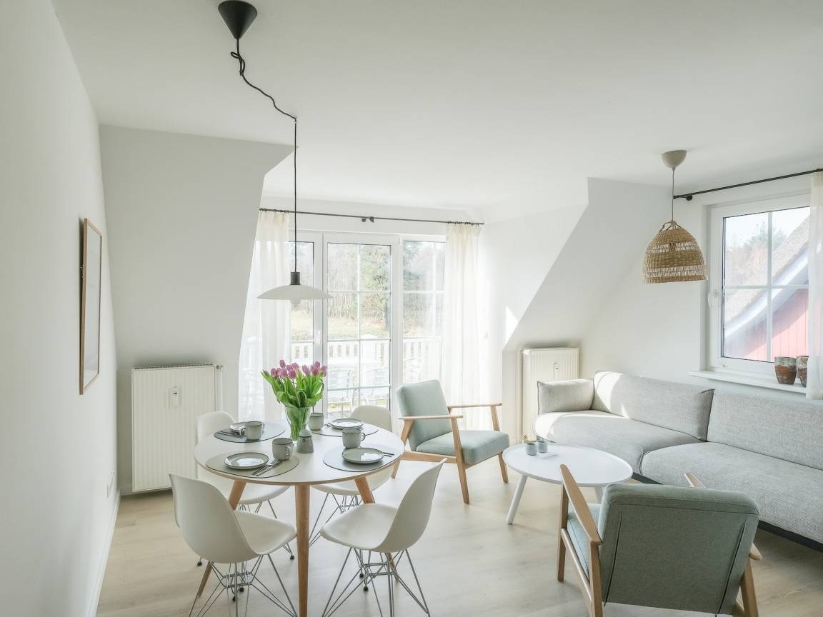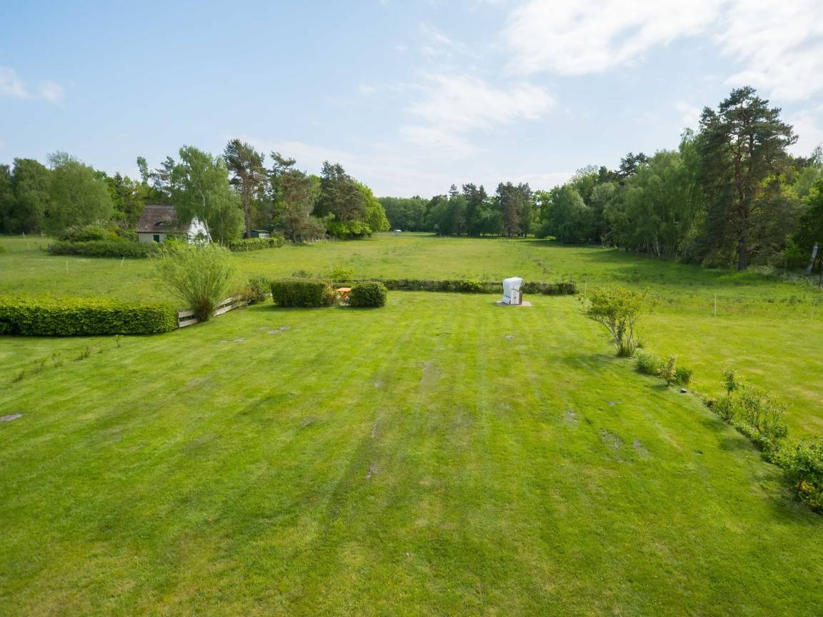 Die ca. 48 qm große, gemütlich und mit viel Liebe zum Detail eingerichtete 3-Zimmer Ferienwohnung - oben links- liegt in einem sehr ruhig, mitten im Grünen des Ostseebades Prerow gelegenen Ferienhaus, nahe zum Weststrand.