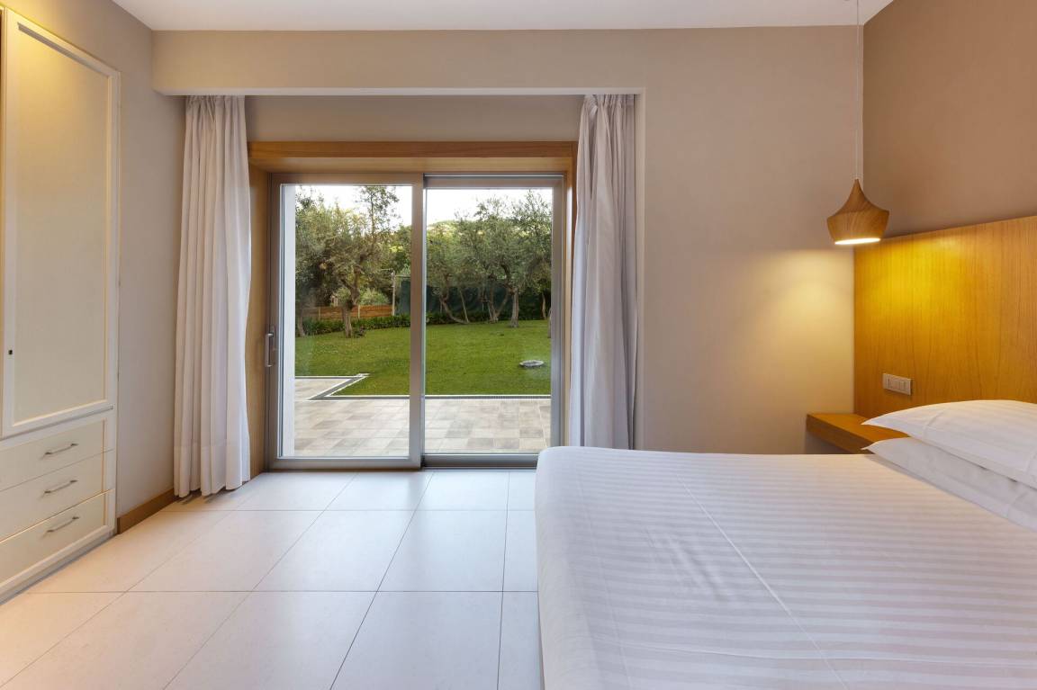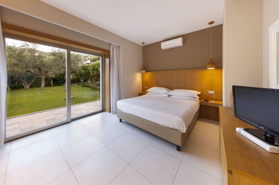 Schlafzimmer mit Bad 4: großes Doppelbett (Breite: 1.8m, Länge: 2m), WiFi Internet, Klimaanlage, TV, Sessel, Schreibtisch, Waschbecken, WC, Bidet, Dusche, Fön, Ausgang auf den Garten.