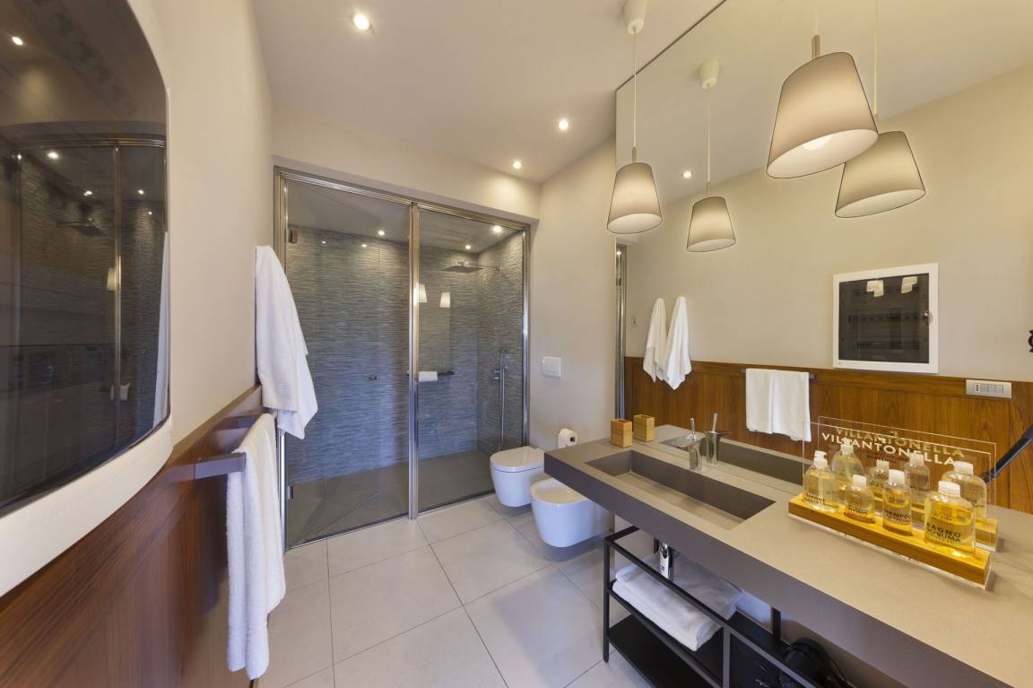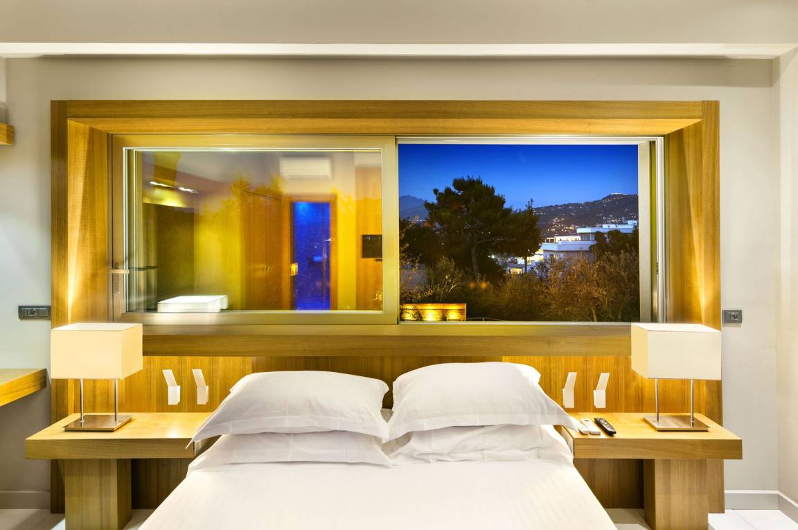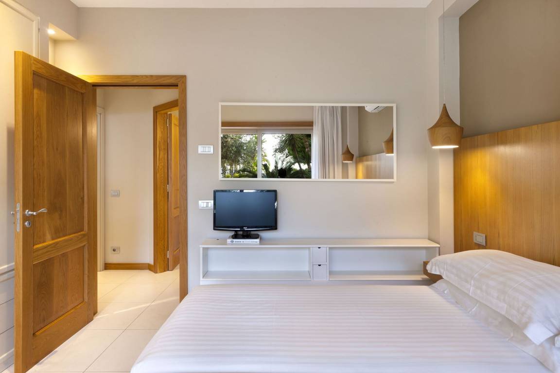 Schlafzimmer mit Bad 1: großes Doppelbett (Breite: 1.8m, Länge: 2m), WiFi Internet, Klimaanlage, TV, Schreibtisch, Safe, Whirlpool-Badewanne, Waschbecken, Doppelwaschbecken, zwei WCs, Bidet, Dusche, Fön, Rauchmelder, Ausgang auf die Terrasse.