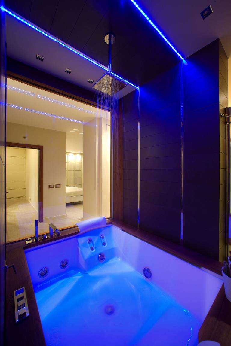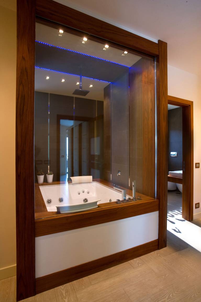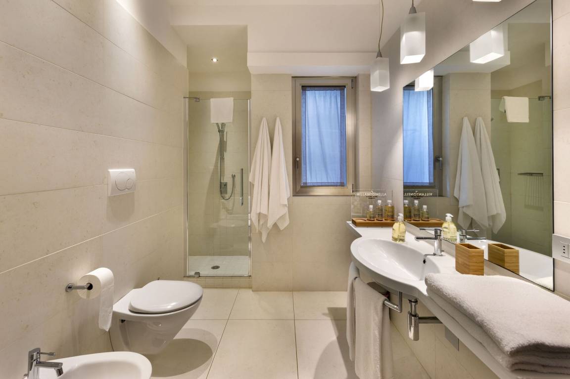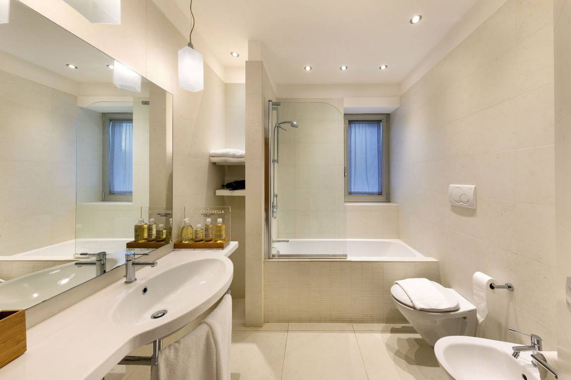 Schlafzimmer mit Bad 1: großes Doppelbett (Breite: 1.8m, Länge: 2m), WiFi Internet, Klimaanlage, TV, Schreibtisch, Safe, Whirlpool-Badewanne, Waschbecken, Doppelwaschbecken, zwei WCs, Bidet, Dusche, Fön, Rauchmelder, Ausgang auf die Terrasse.