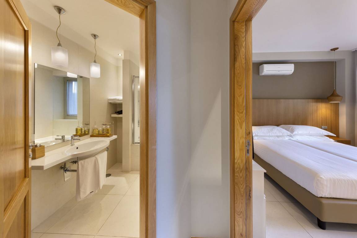 Schlafzimmer mit Bad 6: großes Doppelbett (Breite: 1.8m, Länge: 2m), Krippe, WiFi Internet, Klimaanlage, TV, Waschbecken, WC, Dusche, Fön.