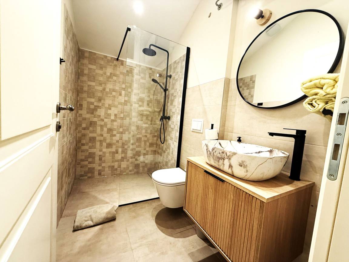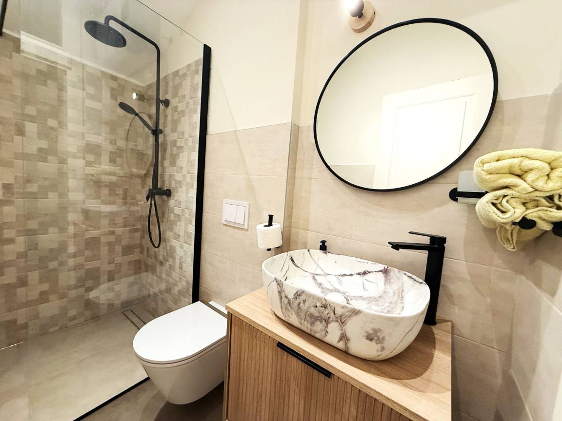 Badezimmer: Waschbecken, WC, Dusche, WiFi Internet.
