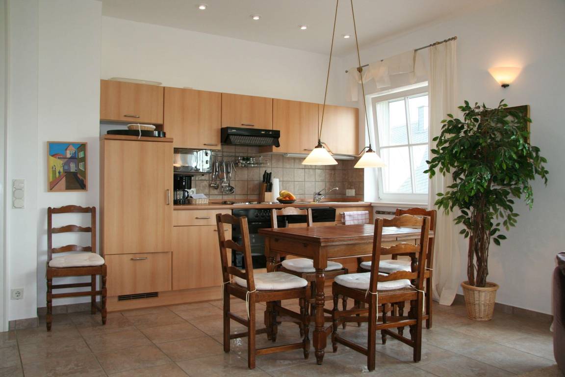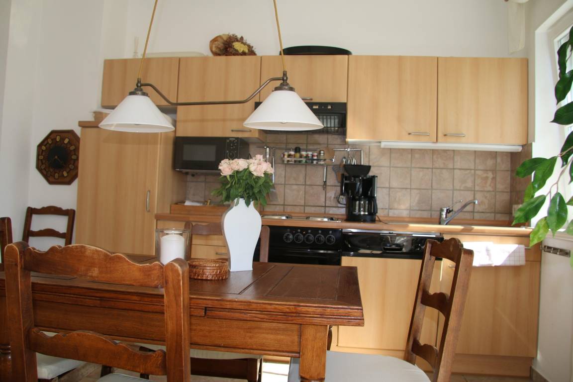 Voll ausgesattete Küchenzeile mit Ceranfeld, Backofen, Abzugshaube, Spülmaschine, Kaffeemaschine, Toaster, Wasserkocher, Kühl- und Gefriermöglichkeit (Gefriertruhe nutzbar), Geschirr für 8 Personen, Geschirrtücher und Tischdecken inklusiv.