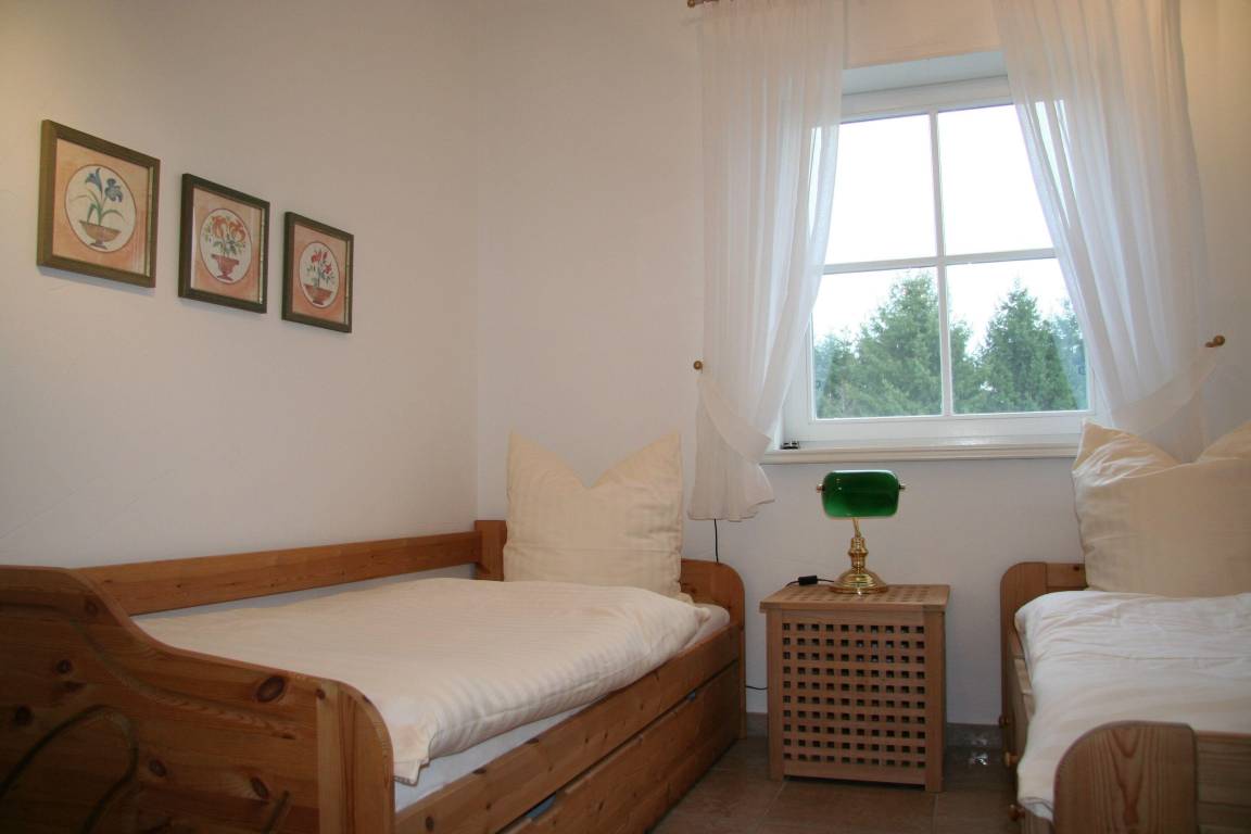 Kinderzimmer: 2 Einzelbetten mit Bettkästen (ggf. 1 Zusatzbett ), Kleiderschrank, Kommode, 1 Sessel. Kinderbett mit Bettwäsche und Hochstuhl auf Anfrage vorhanden.