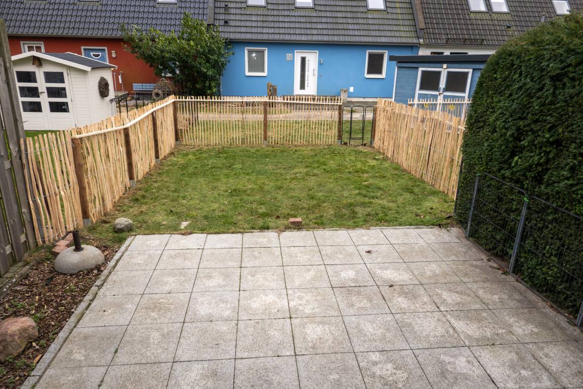 Vom offenen Wohn/Essbereich hat man direkten Zugang zur Terrasse und zum komplett umzäunten (1,20m hoch) Garten.