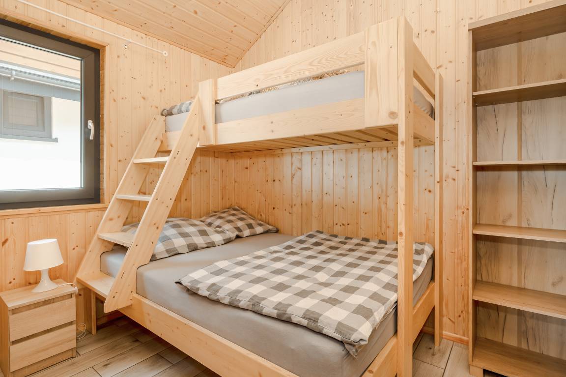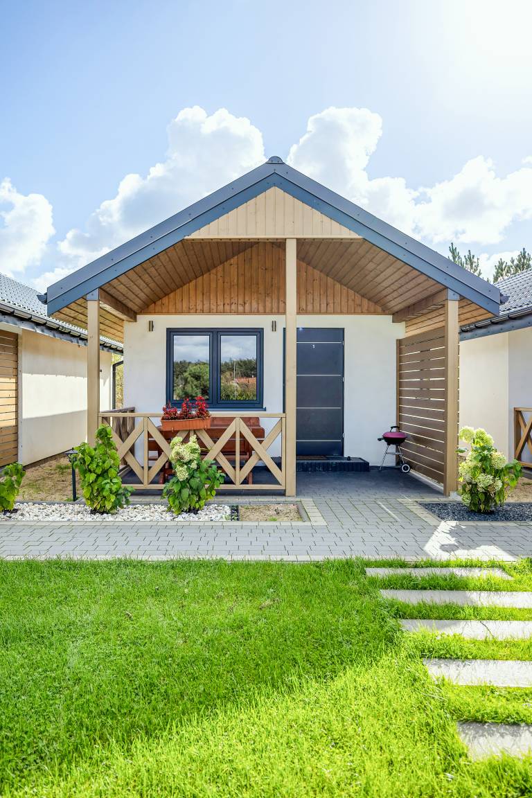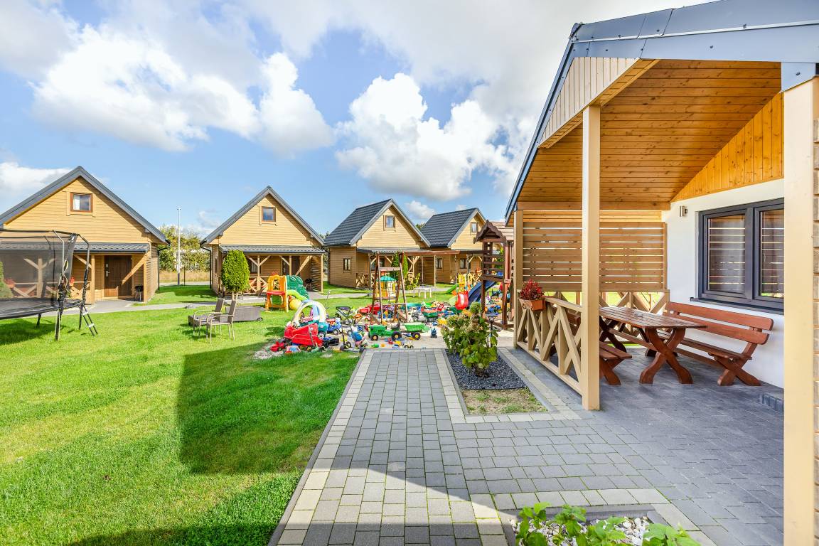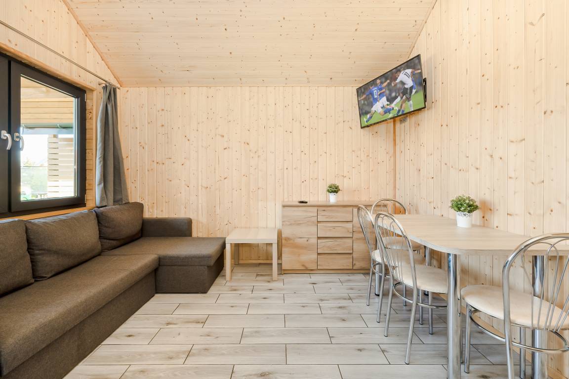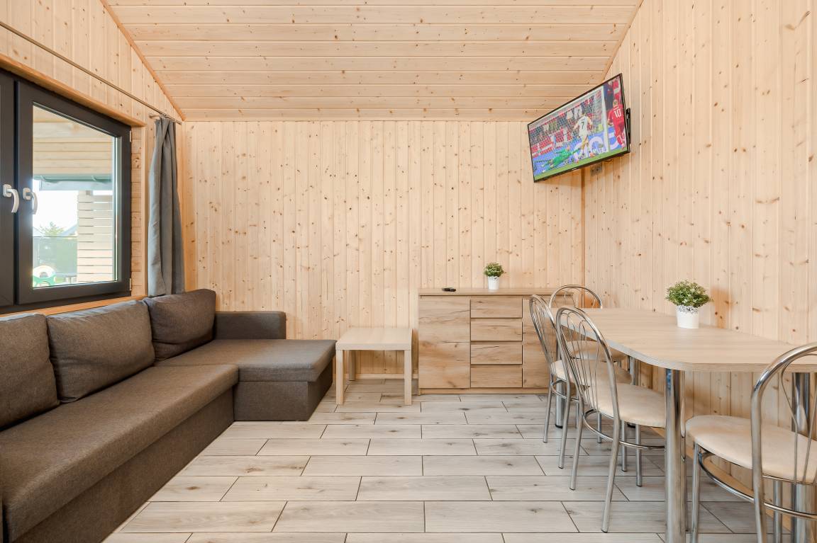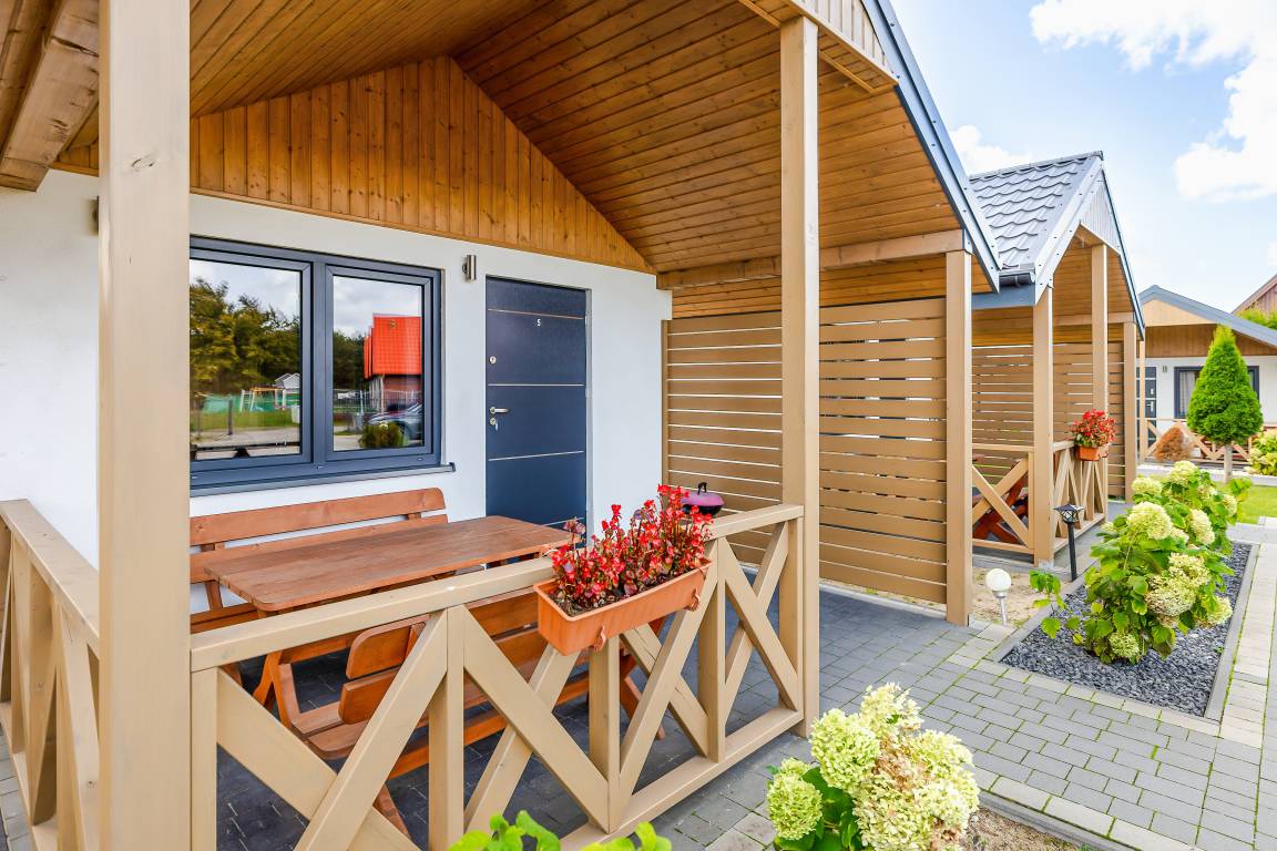 PL 85.16 Ferienhaus 2-5 Pers.: Komfortables 2-Zimmer-Ferienhaus mit 34 qm Wohnfläche. Parterre: Wohn-/Essraum mit Eckcouch (Ausziehcouch 2 Pers.), Flachbild-TV, Esstisch, Küchenzeile (2 E-Platten Induktionsfeld, Abzugshaube, Gefrierfach). Bad: Du, Wb, WC. Dreibettzimmer mit Etagenbett (unten Doppelbett, oben Einzelbett). Große, überdachte Terrasse mit Sitzmöbeln, Grill. Davor schön angelegter Garten und Spielplatz.