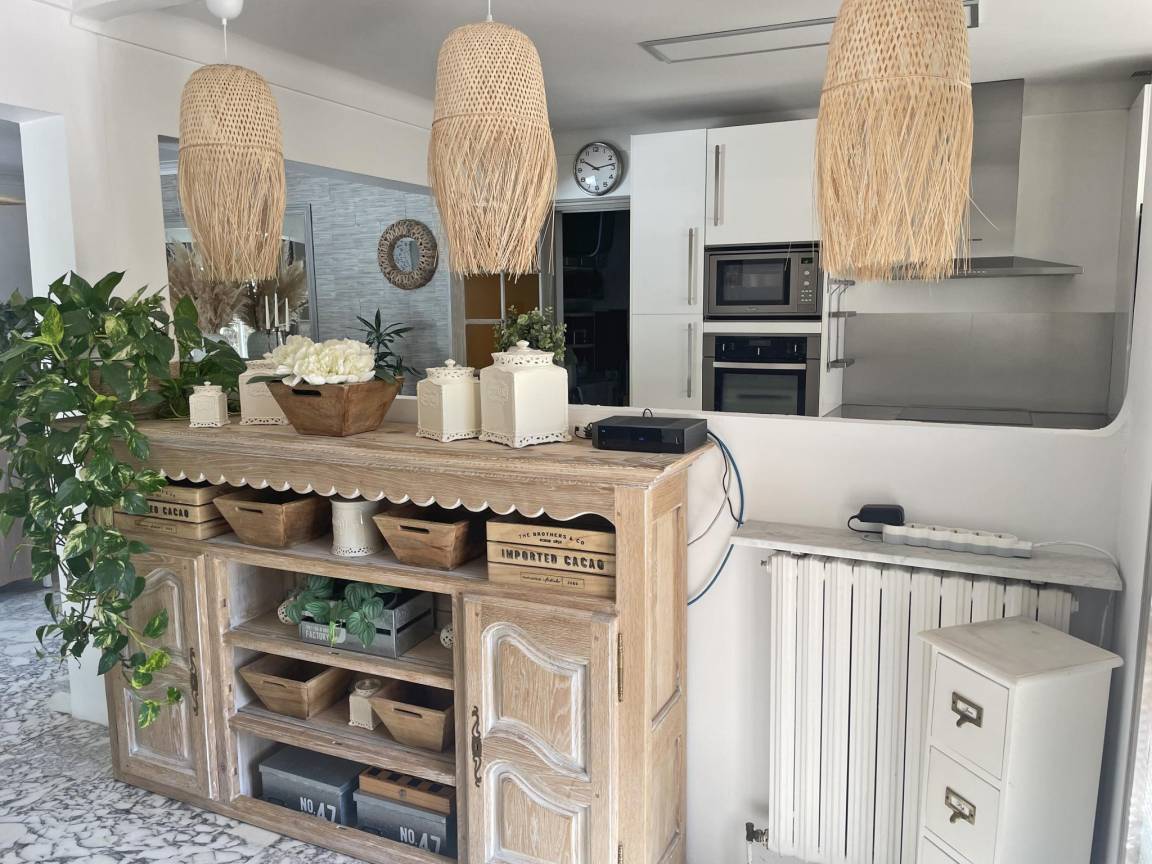 Layout : Parterre: Diele mit Klimaanlage , offene Küche mit Wasserkocher, Toaster, Kochherd(4 Kochplatten, Induktion), Dunstabzugshaube, Kaffeemaschine, Backofen, Mikrowelle, Geschirrspüler, Kühl-/Gefrierkombination, Zitruspresse , Wohn/Esszimmer mit TV(Satellit, internationale TV-Kanäle), Esstisch(6 Personen), Sitzecke, DVD-Player, Klimaanlage , Schlafzimmer mit Doppelbett(160 x 200 cm), Ventilator , Schlafzimmer mit Doppelbett(140 x 200 cm), Ventilator , Schlafzimmer mit Doppelbett(140 x 190 cm), Ventilator , Badezimmer mit Dusche(ebenerdige Dusche, Regen), Waschbecken, Föhn , Badezimmer mit Badewanne mit Dusche, Waschbecken, Toilette , Toilette, Waschraum mit Waschmaschine, Staubsauger, Bügelbrett, Bügeleisen