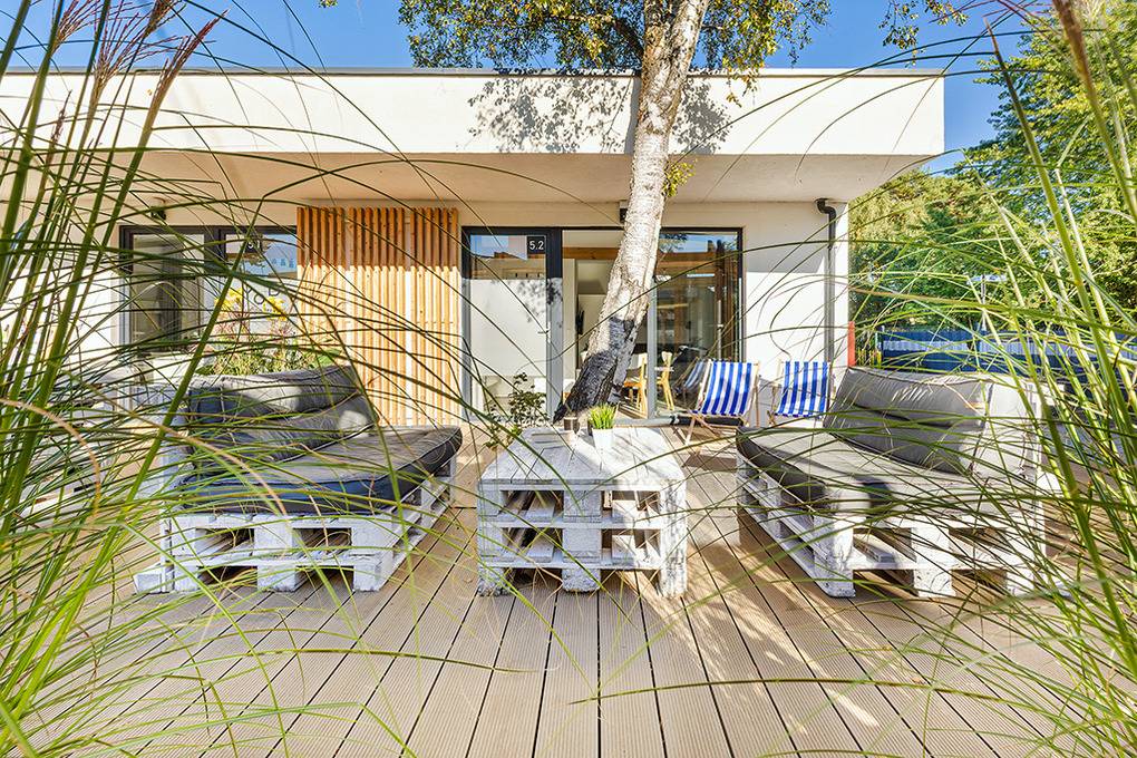 Schöne, komfortable Ferienhäuser mit gemütlicher Einrichtung und großen Terrassen (Sitzmöbel). Alle mit Flachbild Sat-TV (deutsche Programme), kostenlosem Internetzugang über W-Lan. Infrarot-Heizung. Parkplatz auf dem umzäunten Gründstück nach Verfügbarkeit (Gebühr). Weitere Parkplätze auf dem öffentlichen Parkplatz neben der Anlage.