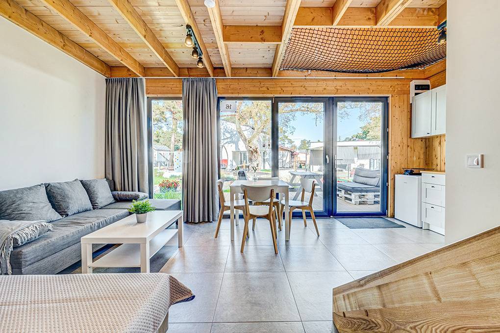 PL 32.13 Ferienhaus 1-6 Pers.: Komfortables Haus mit 50 qm Wohnfläche über 2 Etagen. Parterre: Wohn-/Essraum mit Doppelbett in einer Wohnraum-Nische, durch einen Vorhang vom Wohnraum abtrennbar, Sofa, Flachbild Sat-TV, Esstisch, Küchenzeile (2 Pl. E-Herd, Abzugshaube). Bad: Dusche, Wb, WC. Treppe ins ausgebaute Dachgeschoss: offenes 4-Bettzimmer mit zwei Doppelbetten. Großzügige Terrasse (15 qm) mit Sitzmöbeln.
