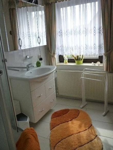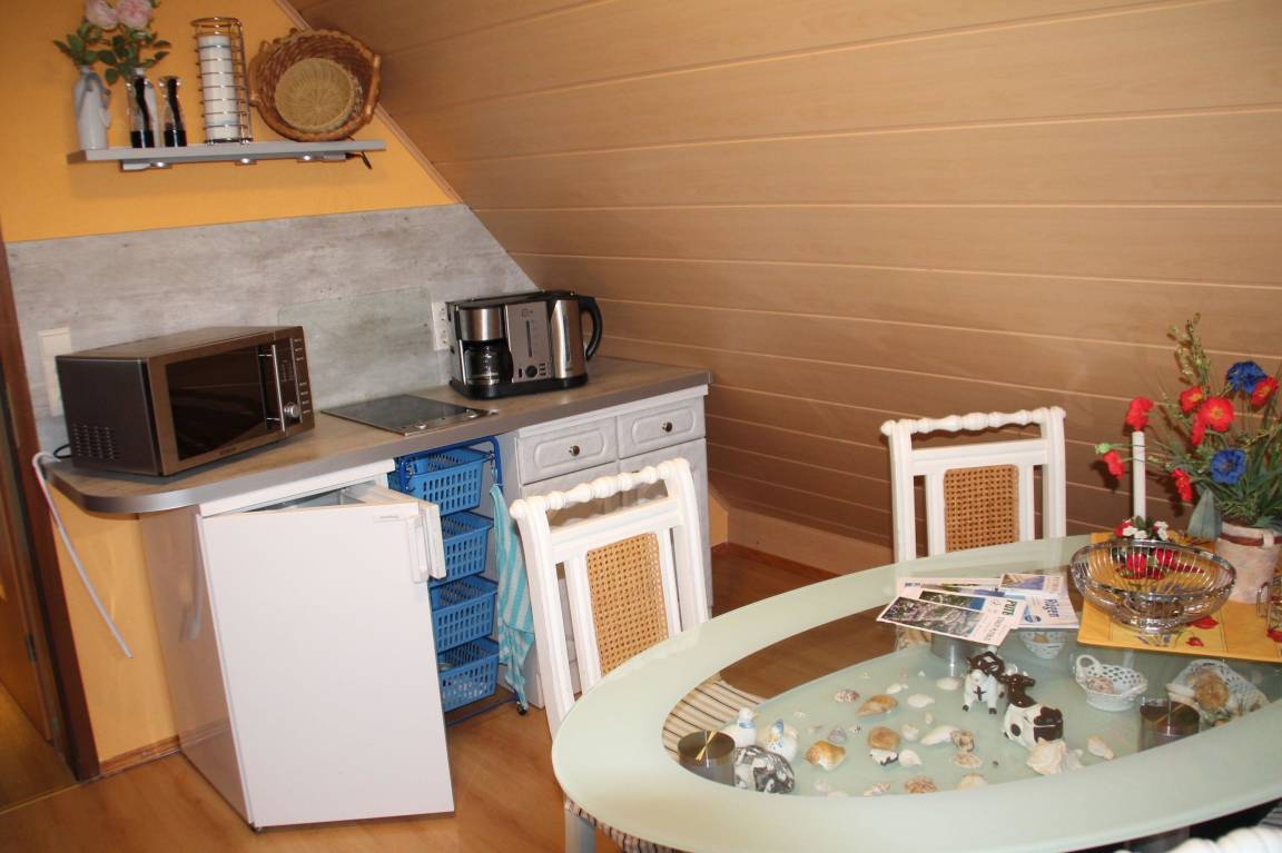 Zur Fewo gehört eine Küche (inclusive Kochmöglichkeit,Wasserkocher,Toaster,Kühlschrank mit Gefrierfach und Mikrowelle), ein Wohnzimmer (inclusive TV und Radio),ein Schlafzimmer und ein Bad mit Dusche.