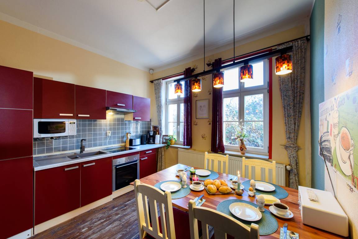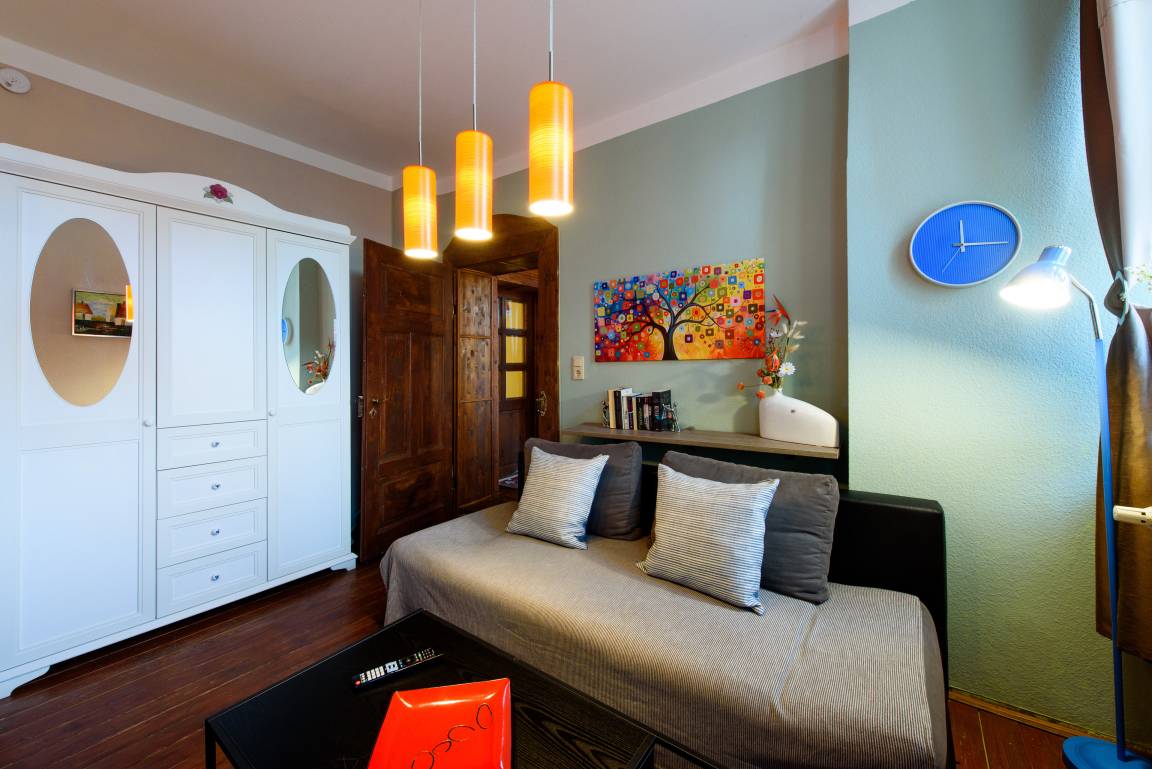 einer modernen Küche und einem Bad (insgesamt 40qm). Hier sind die Zimmer nicht nur farbenfroh und hell gestaltet, sondern strahlen ein wenig das Flair der Sechziger aus. Für einen weiteren Gast ist die Ledercouch schnell zu einer Schlafgelegenheit umfunktioniert. Als sehr angenehm wird die sehr ruhige Lage empfunden, so dass Sie auch bei offenem Fenster wundervoll schlafen können.