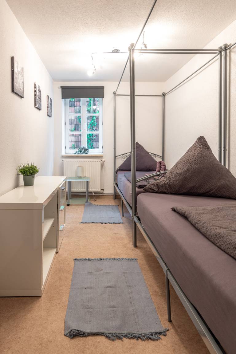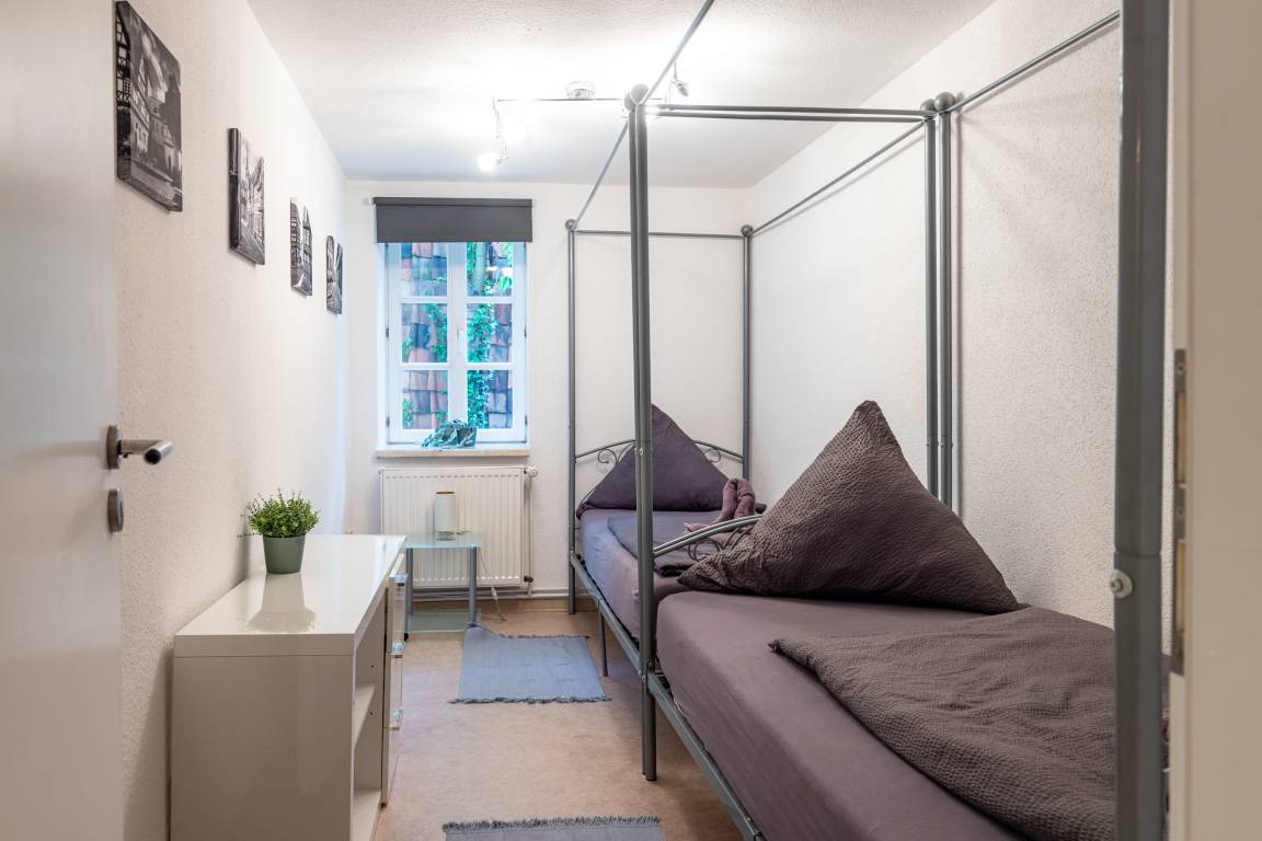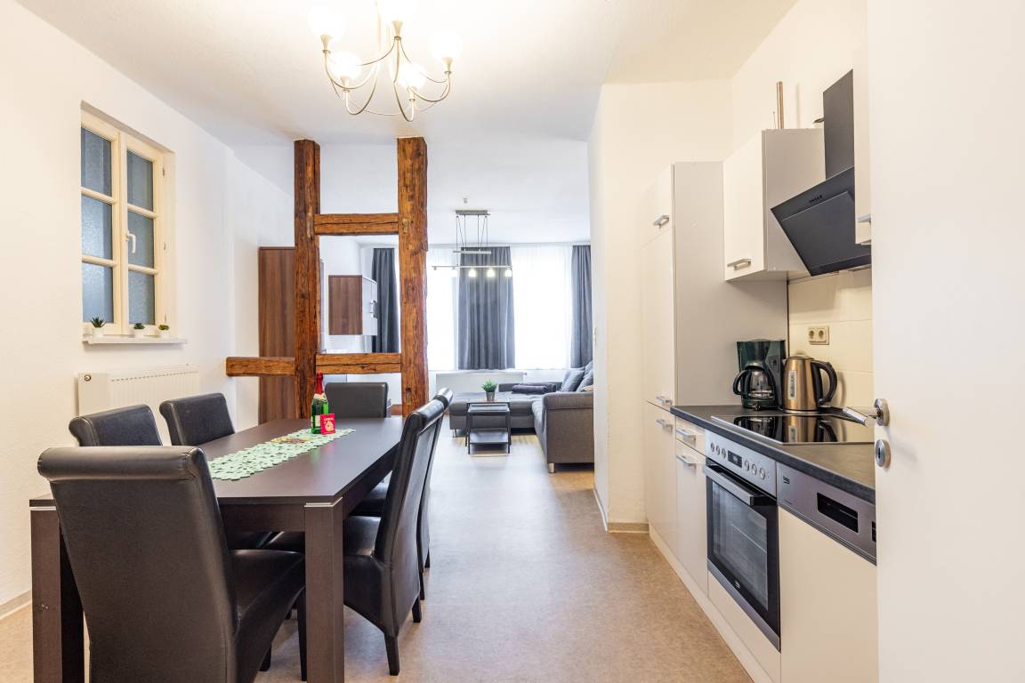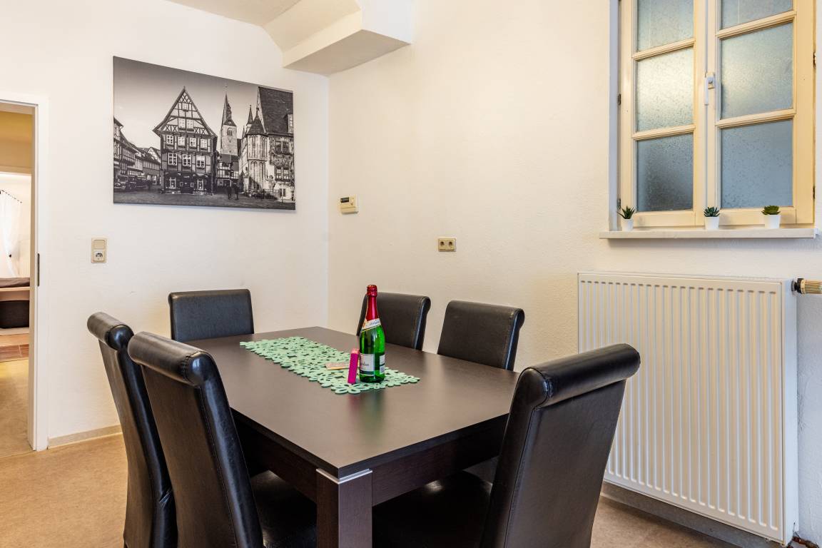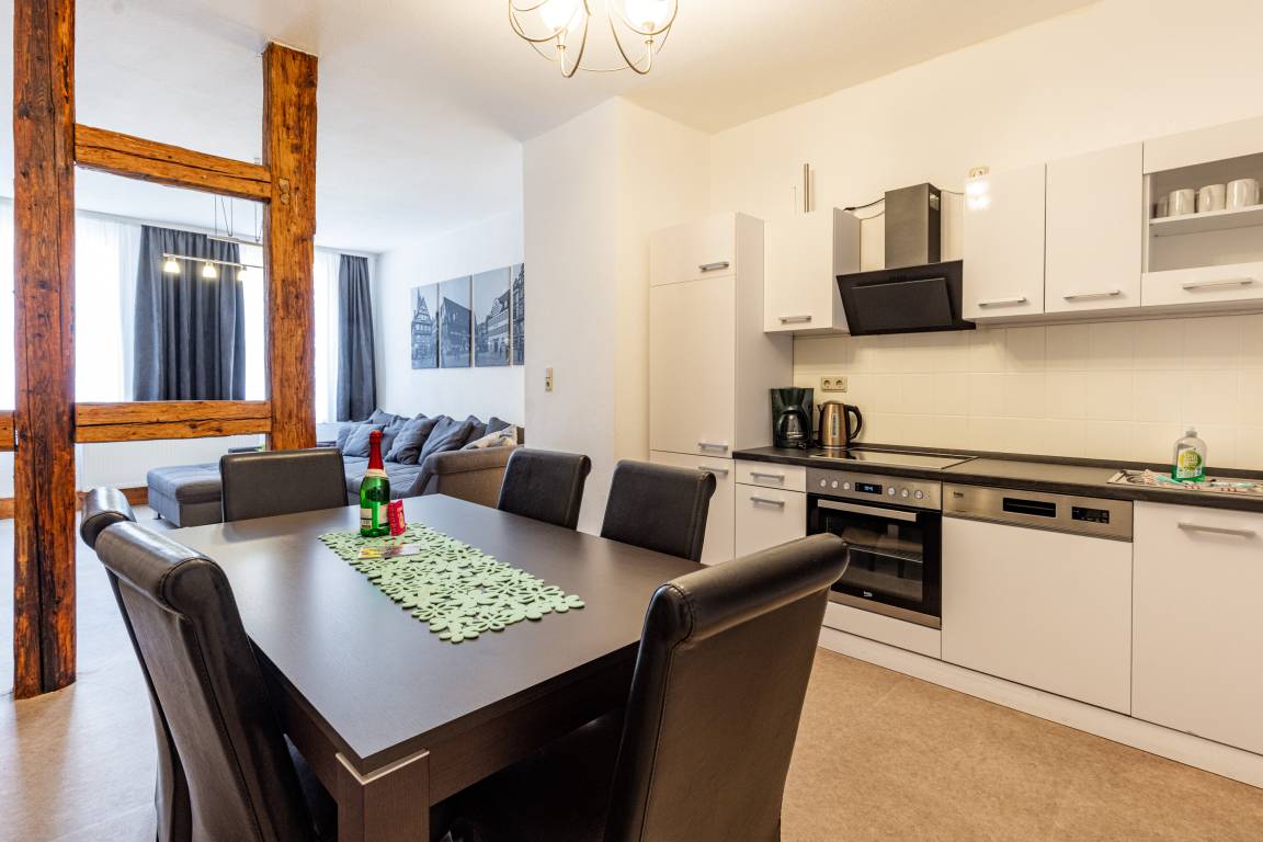 Unsere Ferienwohnung "Zum rost'gen Potte" ist zwar ein echtes Denkmal, trotzdem modern eingerichtet und wurde 2021 frisch renoviert. Im Schlafzimmer entspannen Sie auf einem breiten Boxspringbett - Ihr Gepäck verstauen Sie bequem im separaten Kleiderschrank. Das 2. Schlafzimmer verfügt über 2 Einzelbetten im Himmelbett-Stil. Im Wohnzimmer wartet eine moderne ausziehbare Wohnlandschaft auf Sie - genießen Sie Ihren Abend bei einem guten Glas Wein und einem Buch oder machen Sie sich einen gemütlichen Fernsehabend vor unserem Flachbild-TV! Die Wohnlandschaft kann bei Bedarf auch in eine dritte Schlafmöglichkeit verwandelt werden. Zusätzlich gibt es im Wohnzimmer einen separaten Eßbereich. Die modern eingerichtete Küche verfügt über einen Herd mit Ceranfeld, Backofen, Spülmaschine, Kühlschrank mit Tiefkühlfach, Wasserkocher, Kaffeemaschine und Toaster. Im Bad finden Sie Dusche, Badewanne, Waschbecken, Waschmaschine und WC. Die Ferienwohnung verfügt über kostenloses W-Lan. Fahrräder können in der Hofdurchfahrt sicher und überdacht abgestellt werden.