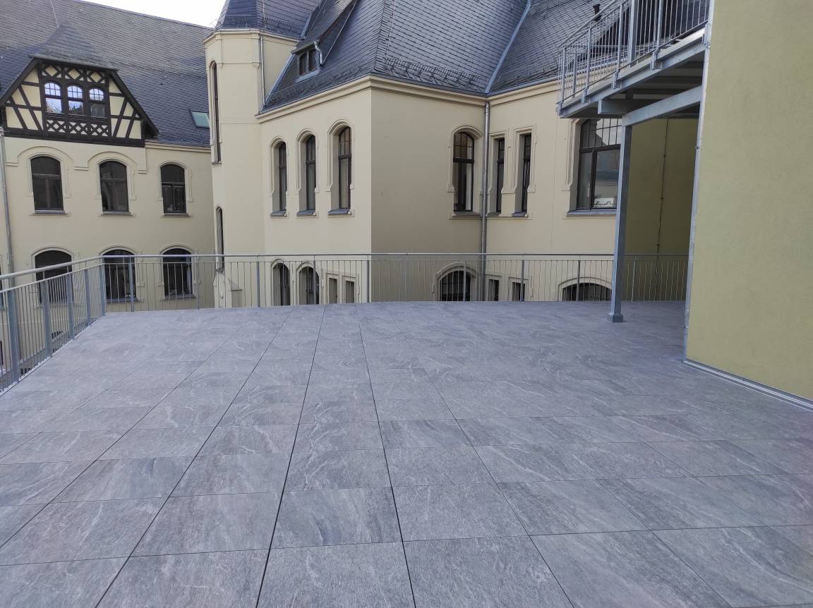 Für die Ferienwohnung steht eine 27 m² große Gemeinschaftsterrassen zur Verfügung. Alternativ kann die 130 m² große Hauptterrasse als Ausweichmöglichkeit genutzt werden.