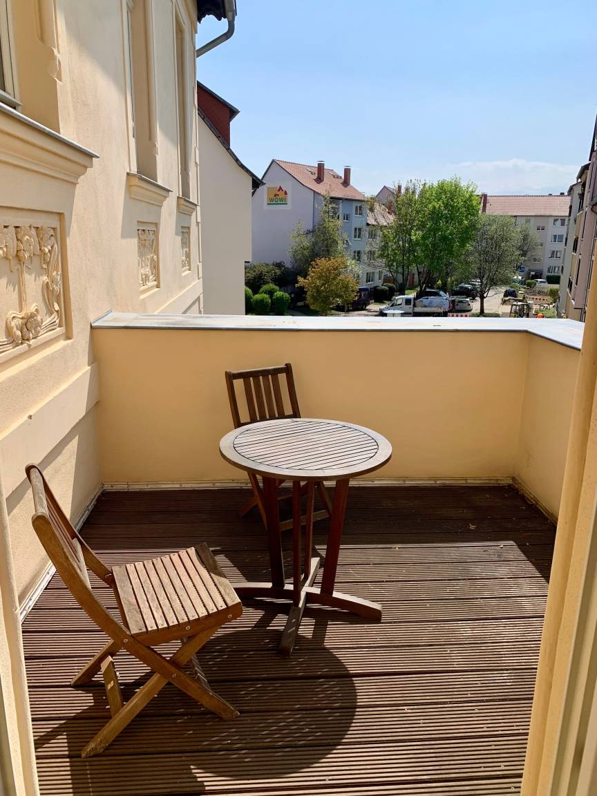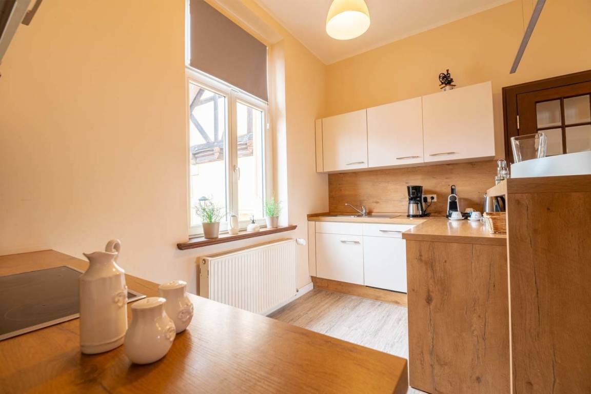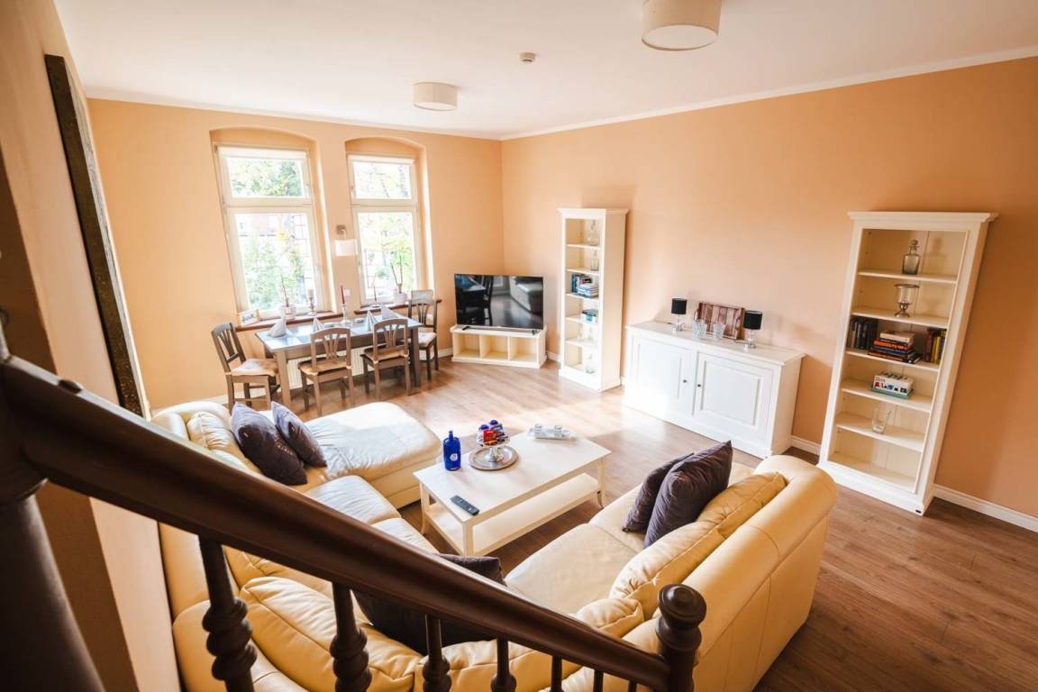 Auf einer Wohlfühlfläche von 120 qm erwartet Sie ein wunderschöner Blick auf das malerische Quedlinburg. Die Besonderheit in diesem Appartement ist das großzügige Wohnzimmer mit Essbereich und Zugang zur kleinen Terrasse, so finden auch Freunde oder Familie einen Platz zum verweilen.