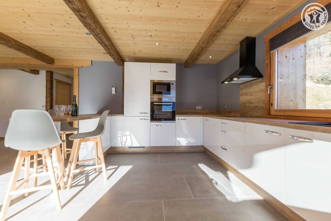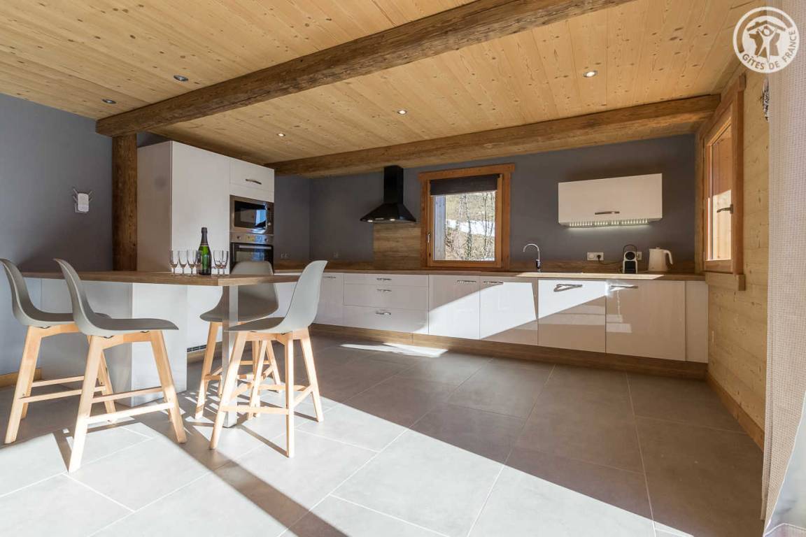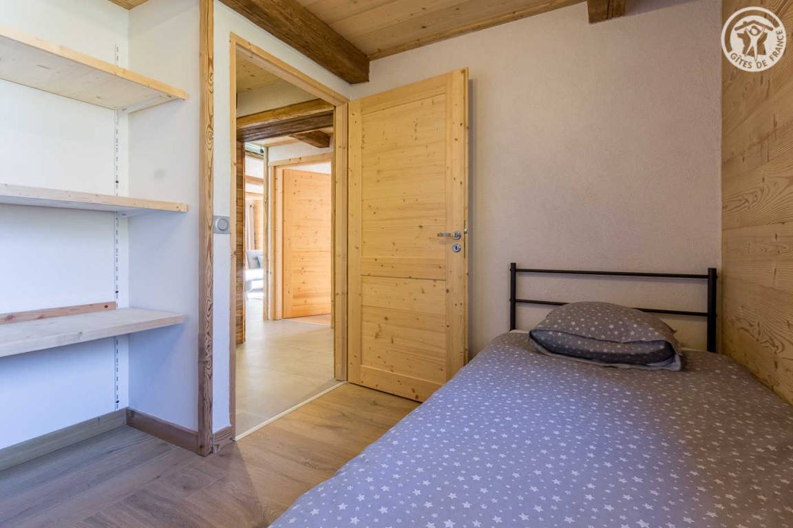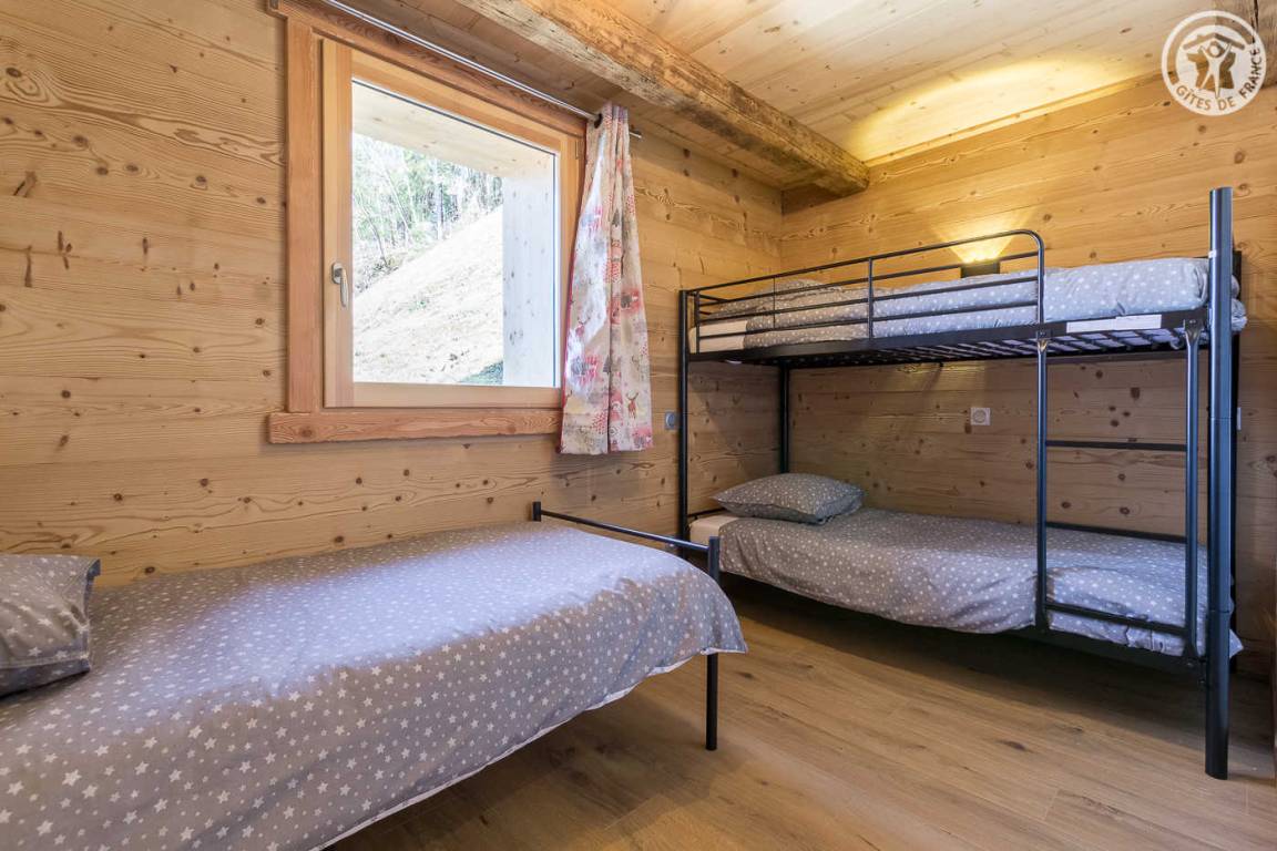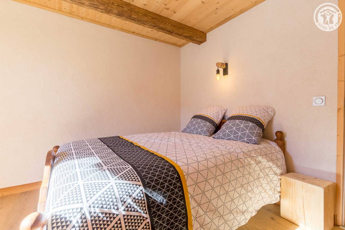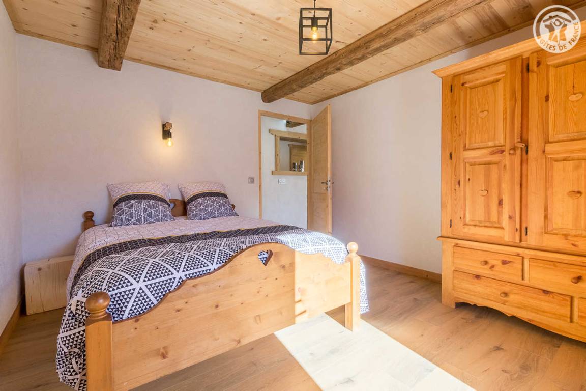 Gîte im Erdgeschoss des Chalets der Eigentümer. Zufahrt über einen absteigenden Weg (Parken an der höher gelegenen Gemeindestraße im Winter, 50 Meter entfernt). Eingang, Wohnküche mit großer Balkonterrasse von 50 m². 3 Schlafzimmer (1 Doppelbett 160x200 cm / 1 Doppelbett 140x200 cm / 2 Etagenbetten 90x190 cm + 1 Einzelbett 90x190 cm), Badezimmer (italienische Dusche), Toilette, Waschküche. Grundstück wird mit den Eigentümern geteilt.