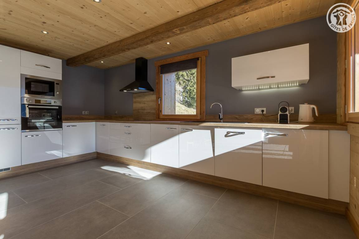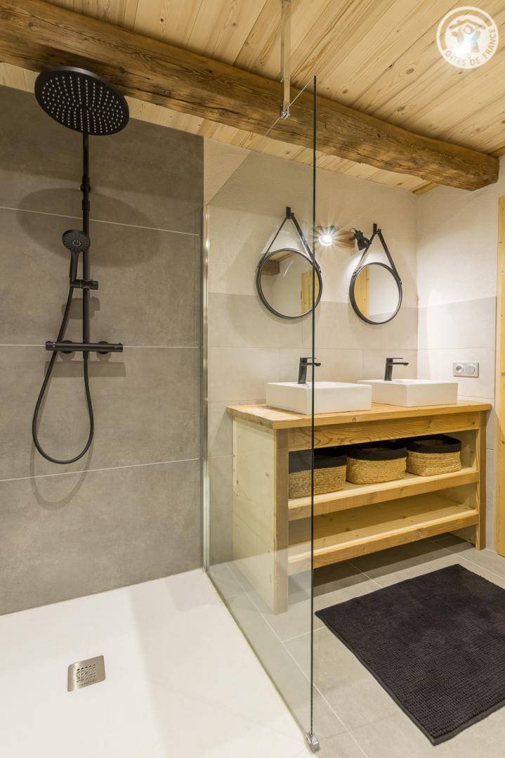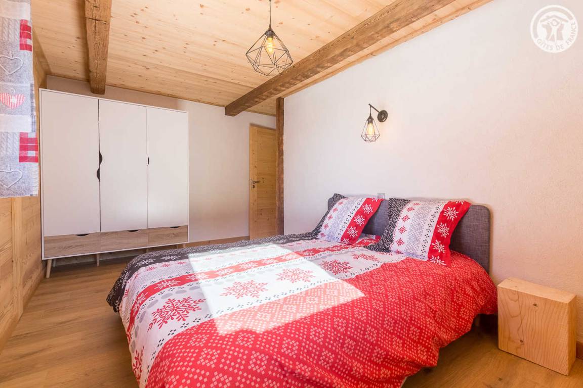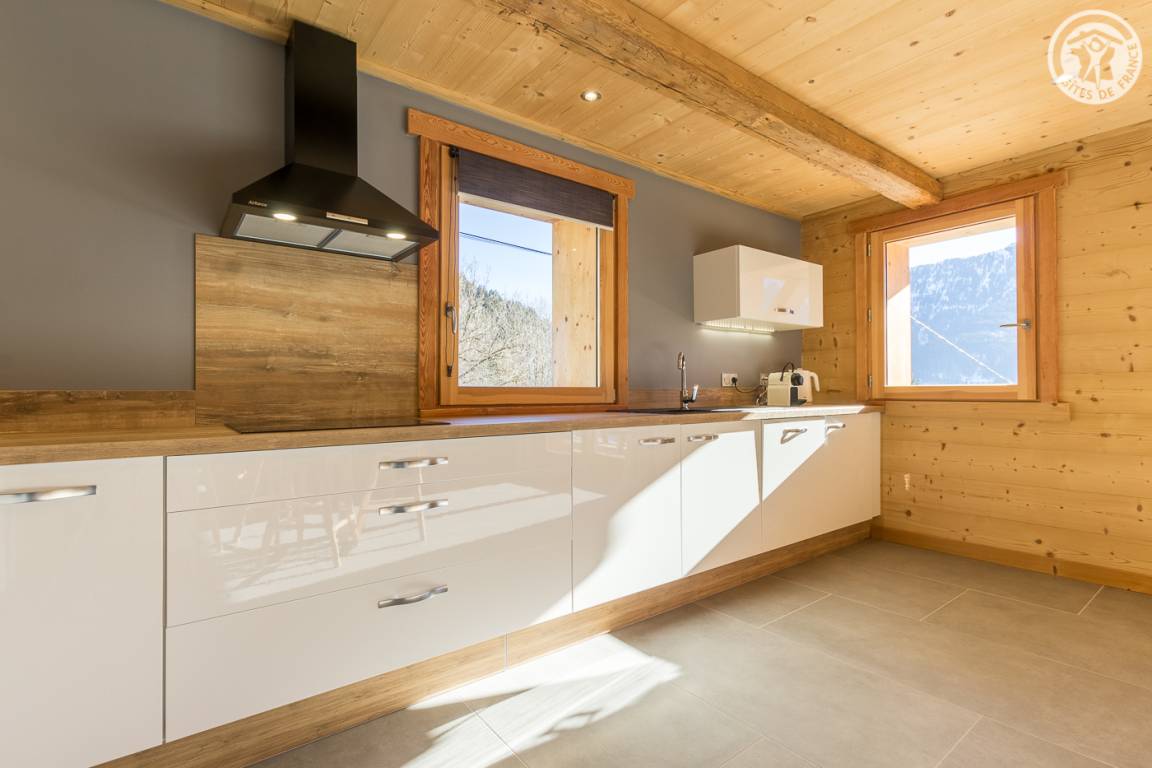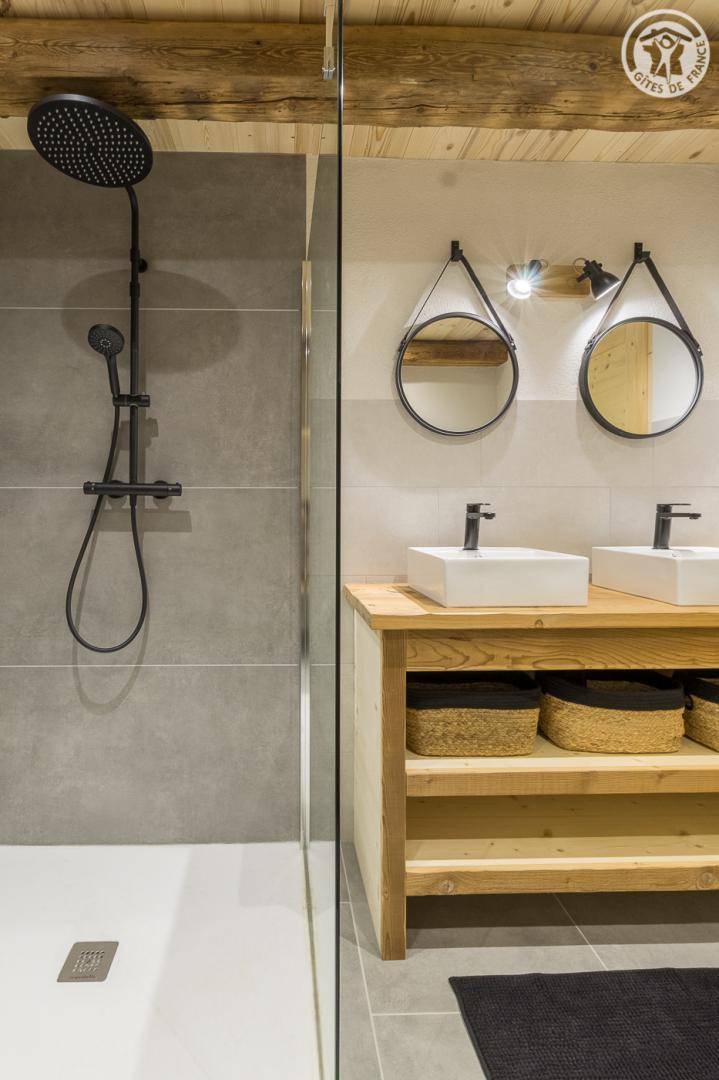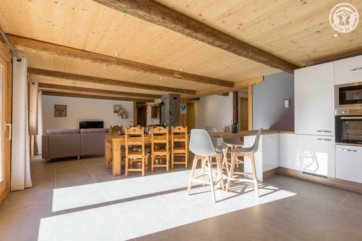 Gîte im Erdgeschoss des Chalets der Eigentümer. Zufahrt über einen absteigenden Weg (Parken an der höher gelegenen Gemeindestraße im Winter, 50 Meter entfernt). Eingang, Wohnküche mit großer Balkonterrasse von 50 m². 3 Schlafzimmer (1 Doppelbett 160x200 cm / 1 Doppelbett 140x200 cm / 2 Etagenbetten 90x190 cm + 1 Einzelbett 90x190 cm), Badezimmer (italienische Dusche), Toilette, Waschküche. Grundstück wird mit den Eigentümern geteilt.