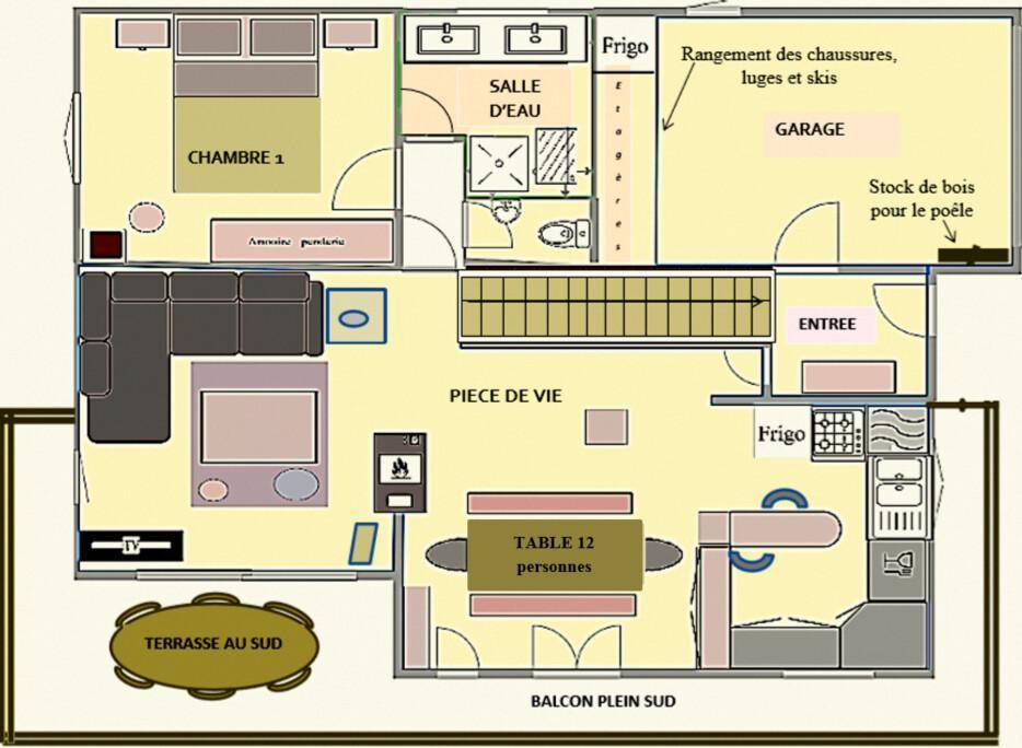 Holzblockchalet auf 3 Ebenen. 1. Ebene (ebener Zugang vom Parkplatz): Eingang, Wohnzimmer-Küchen-Lounge-Bereich mit Zugang zu einer geschützten Terrasse (Essbereich für 10 Personen), 1 Schlafzimmer für 2 Personen (1 Doppelbett 160x200 cm), Badezimmer (Dusche), separates WC. Oben: Zwischengeschoss, offen zum Wohnzimmer/Lesebereich und Brettspielen. 3 Schlafzimmer (2 Schlafzimmer 1 Doppelbett 160x200 cm/ 1 Schlafzimmer 4 Einzelbetten 90x190cm), Badezimmer (Badewanne mit Duschstange und WC). Auf der Gartenebene (Zugang von außen über Holzstufen möglich): Wohnküche (Kühlschrank mit Konservator, 2 Cerankochfelder, Mikrowelle), Wohnbereich (Doppelschlafcouch 140x200 cm), 1 Schlafzimmer (1 Doppelbett 160x200 cm) , ein Badezimmer (ebenerdige Dusche, Eck-Whirlpool, 2 Waschbecken und WC). Fußbodenheizung durch Sonnenkollektoren (zusätzlicher Elektroboiler). Privater Parkplatz auf dem Grundstück + Garage.