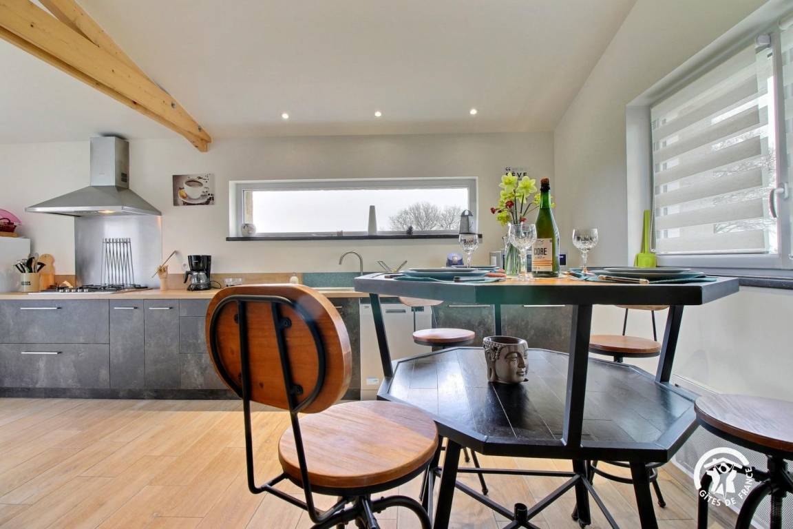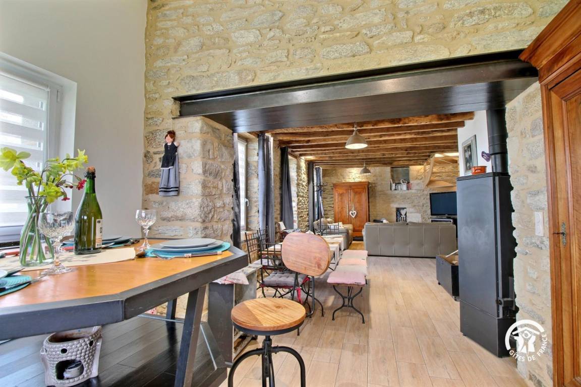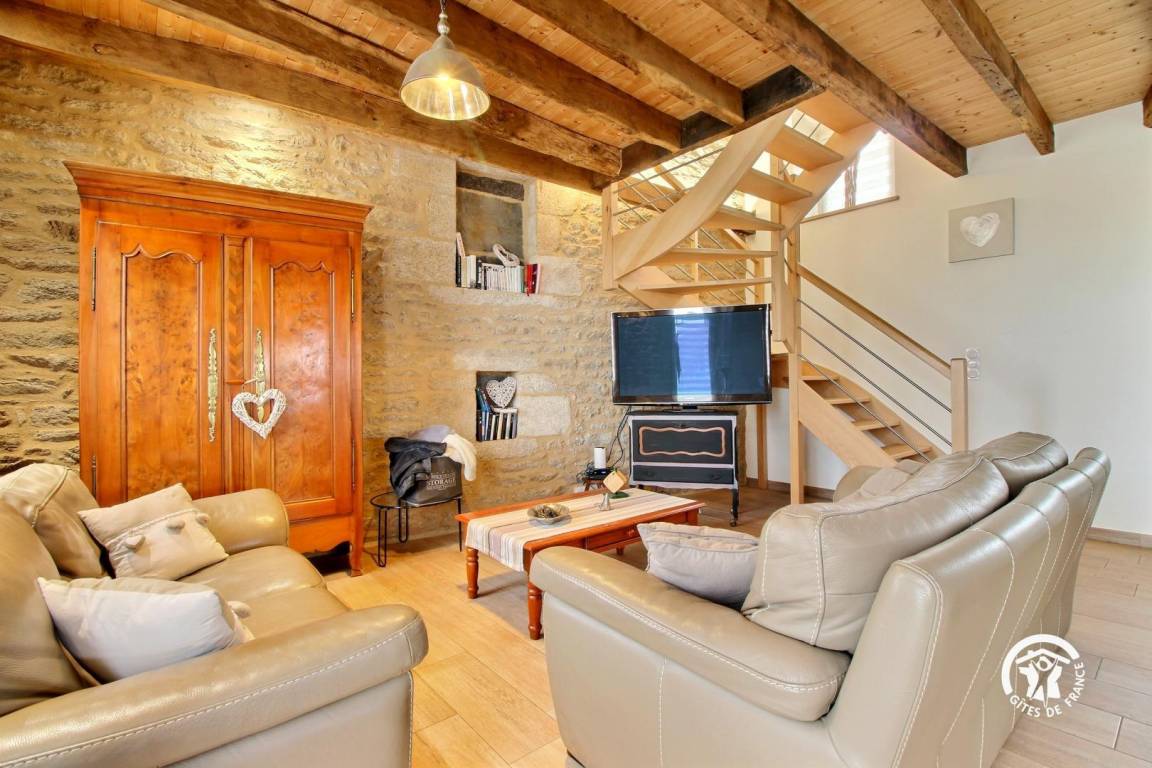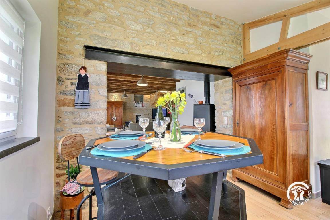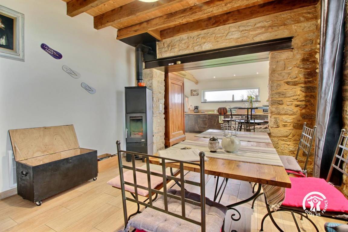 Eingebettet im Herzen der Landschaft von Questembertoise verbindet dieses Cottage den Charme alter Steine und freiliegender Balken mit einem Hauch von Modernität, um eine einladende und warme Atmosphäre zu schaffen.
