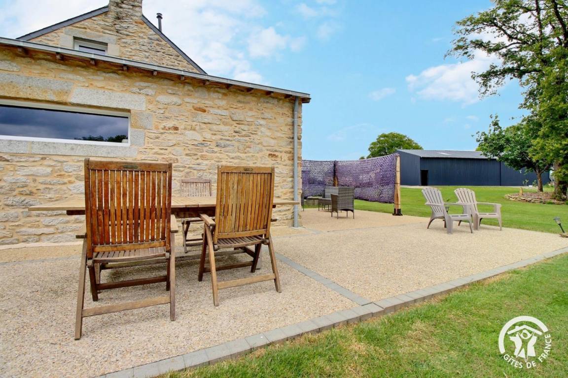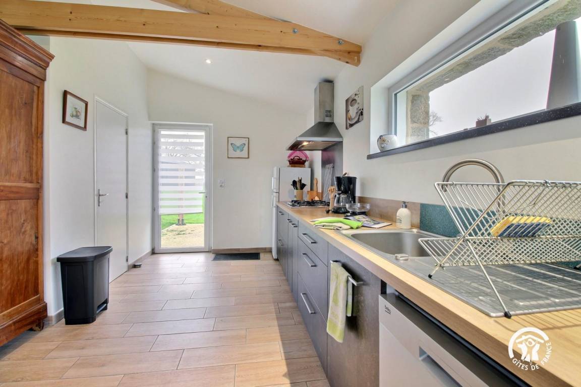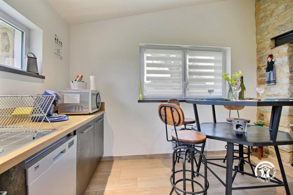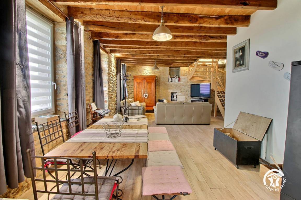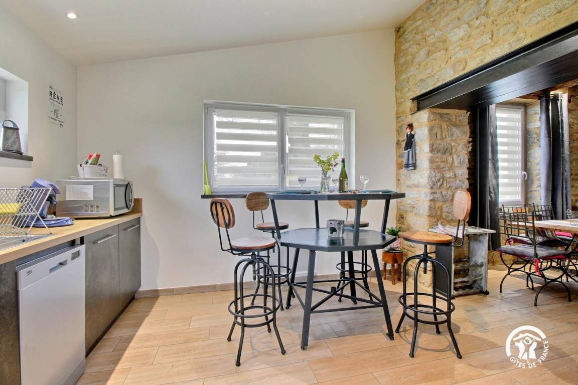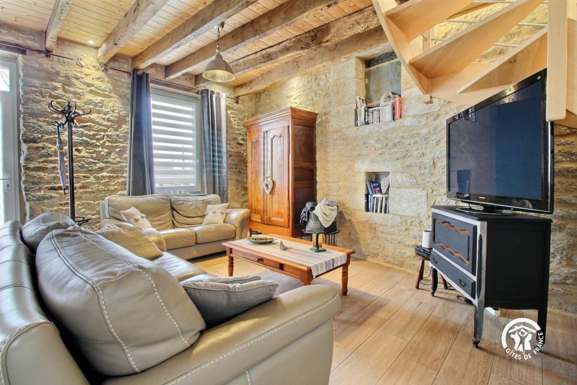 Eingebettet im Herzen der Landschaft von Questembertoise verbindet dieses Cottage den Charme alter Steine und freiliegender Balken mit einem Hauch von Modernität, um eine einladende und warme Atmosphäre zu schaffen.