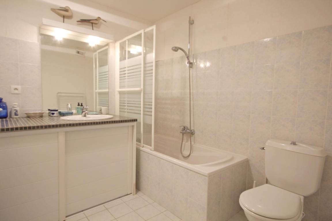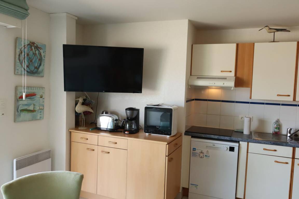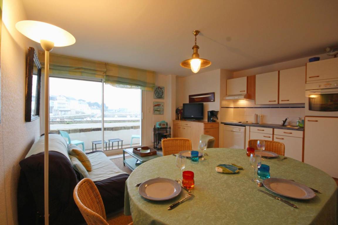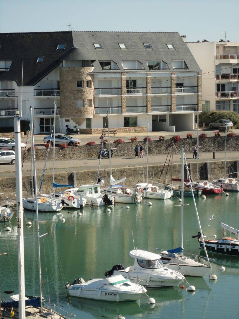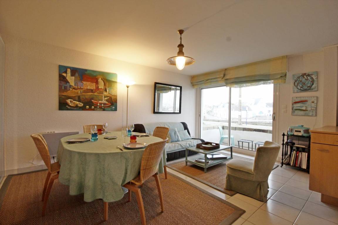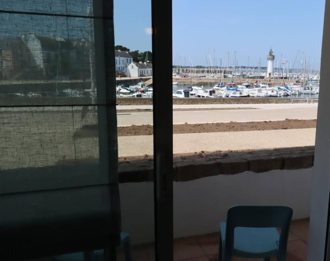 The seaside resort of Quiberon is well-known for its beaches, rugged coastline and thalassotherapy centre. The peninsula with its picture postcard scenery is ideal for walking, swimming, fishing, horse riding, tennis, cycling (cycle lanes) or just relaxing. This flat is in a peaceful setting overlooking the sea at beautiful Port Haliguen, within easy reach of shops and beaches. Lounge-diner and open-plan kitchen, all with sea views. Bedroom 1 : king-size bed. Bedroom 2 : double bed. Bathroom with WC. Extra charge for electric heating. A narrow patio with a low wall overlooking the sea runs the length of the flat. No private parking space, but public car park 200m and spaces in nearby streets. Extra electricity, if allowance exceeded : 0.0898€ per kWh.