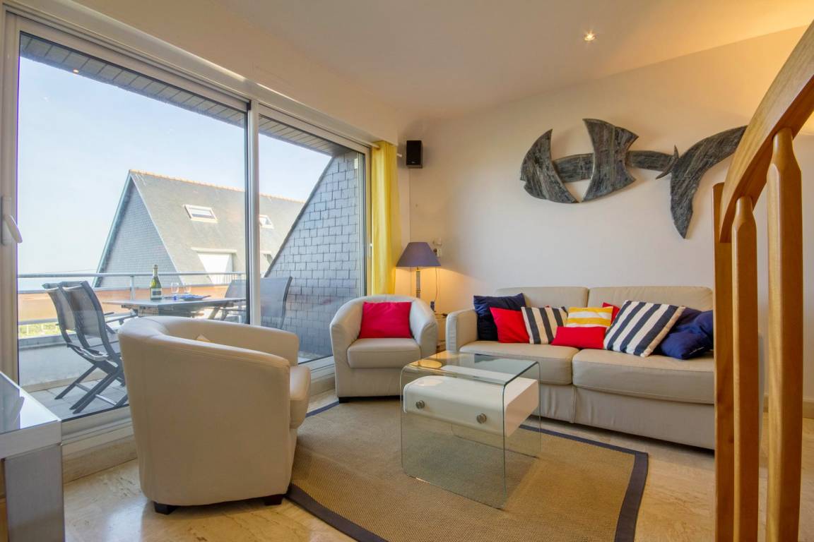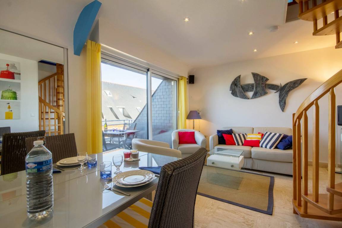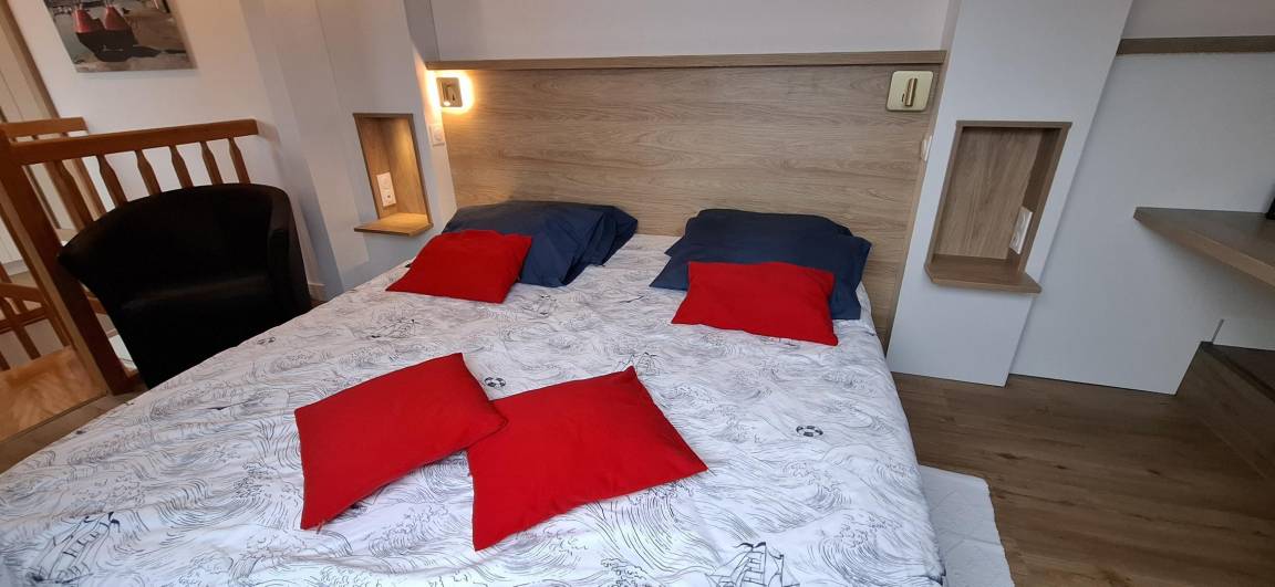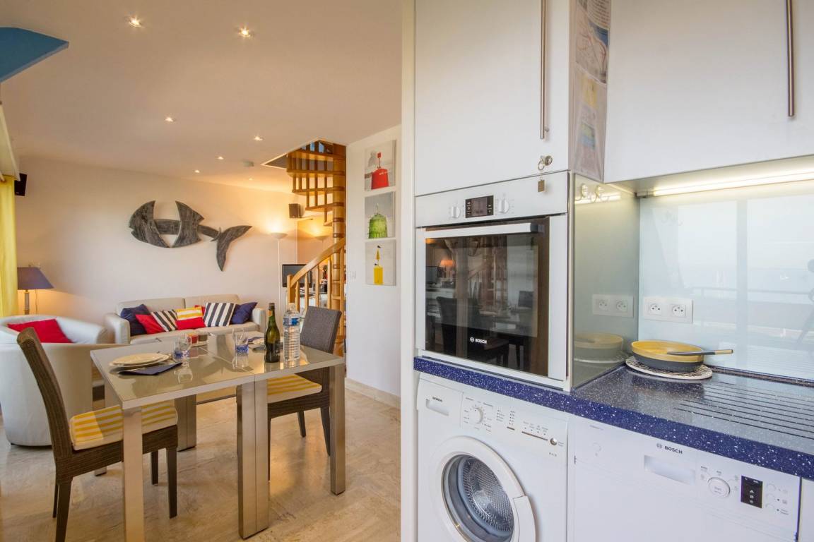 Das 24 m² große Wohnzimmer mit voll ausgestatteter Küche, Essbereich und Wohnzimmer ist mit seinen 2 Balkonen zum Meer ausgerichtet. Die Wohnung verfügt über ein Badezimmer mit WC und ein Schlafzimmer im Zwischengeschoss mit 1 Bett 180 (teilbar in 2 x 90).