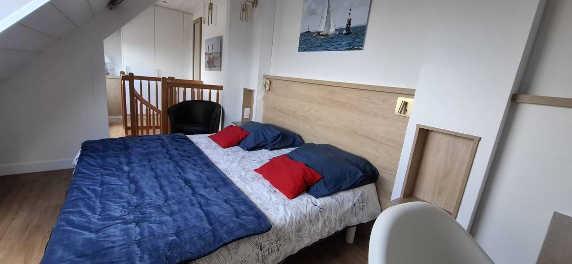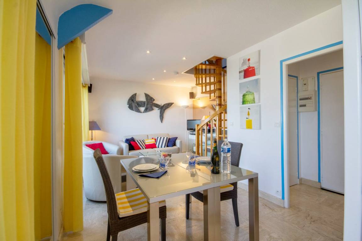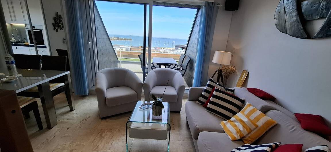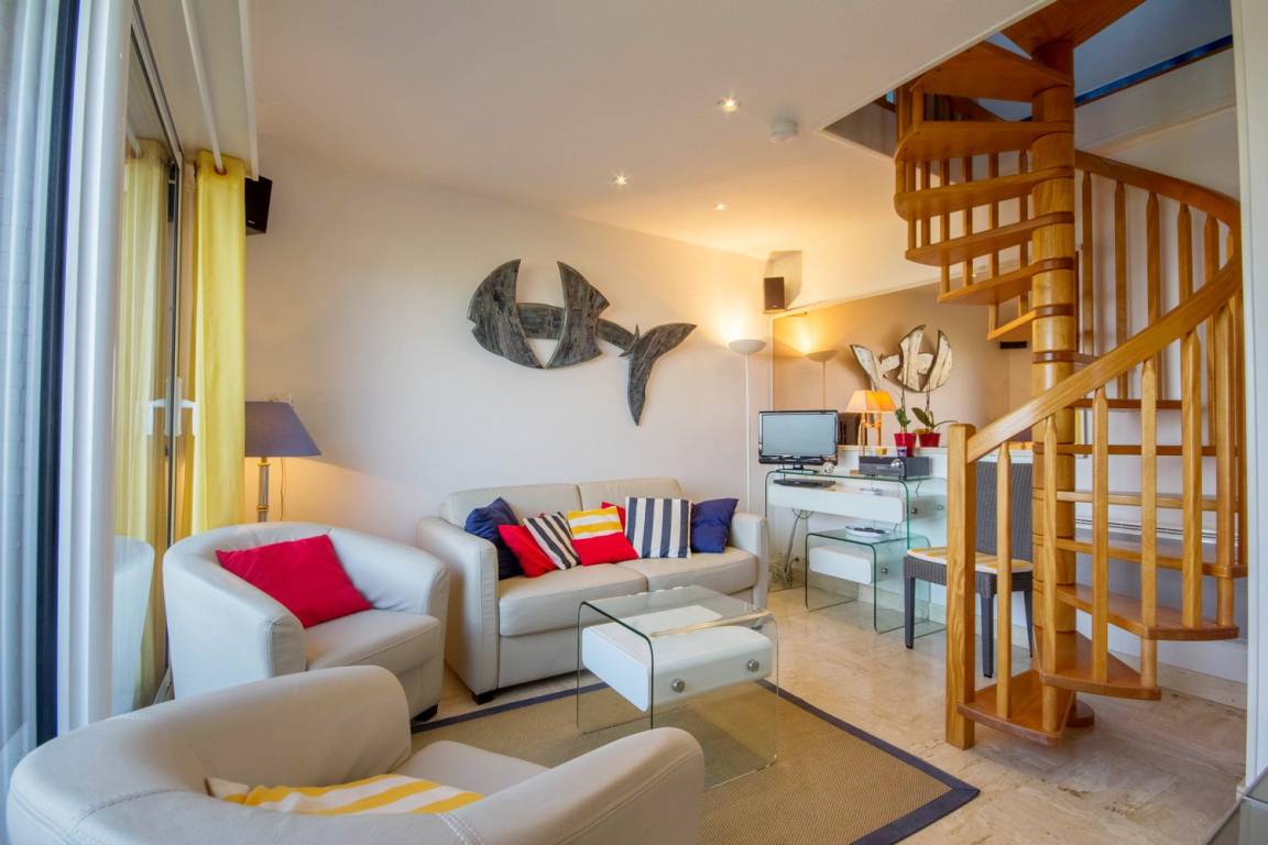 Das 24 m² große Wohnzimmer mit voll ausgestatteter Küche, Essbereich und Wohnzimmer ist mit seinen 2 Balkonen zum Meer ausgerichtet. Die Wohnung verfügt über ein Badezimmer mit WC und ein Schlafzimmer im Zwischengeschoss mit 1 Bett 180 (teilbar in 2 x 90).