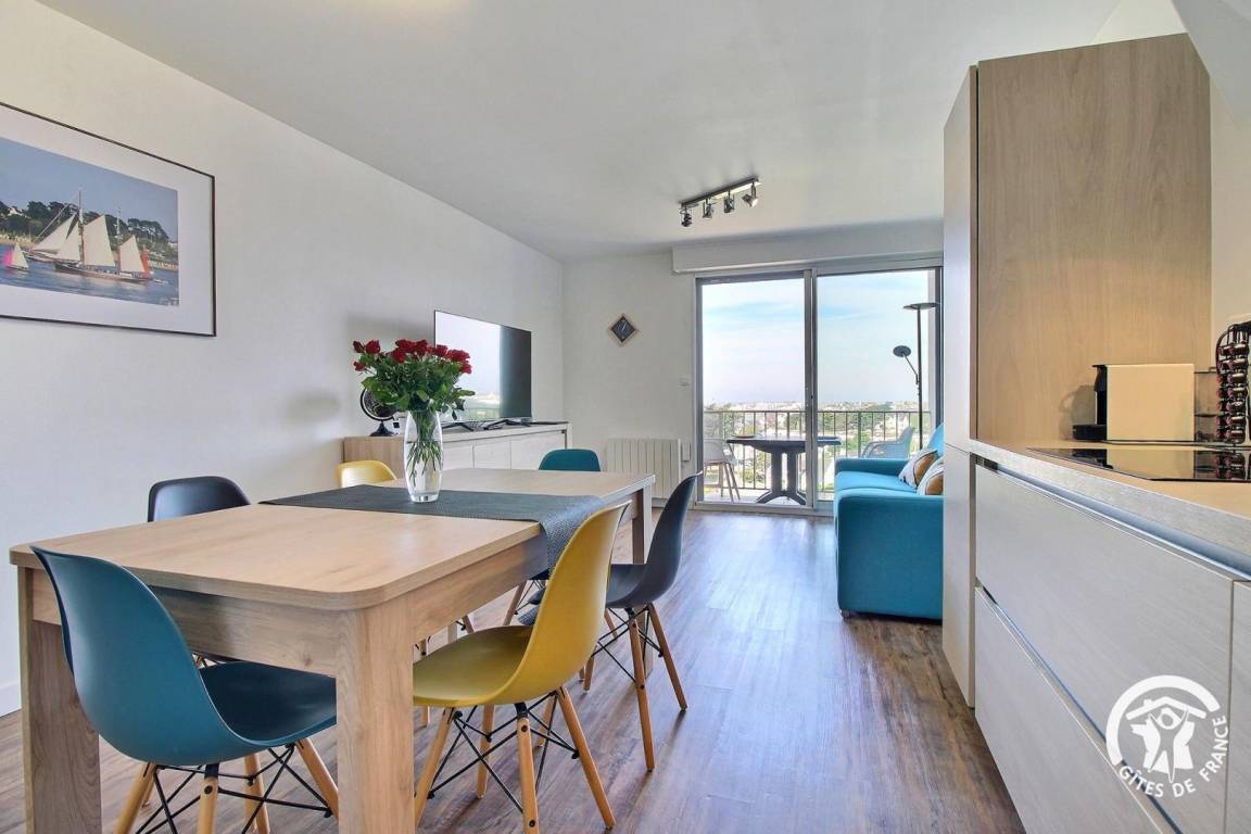 - Wohnzimmer mit Küche, offen zum Wohn-/Esszimmer, mit Zugang zu einem Balkon mit Meerblick, ausgestattet mit Tisch und Stühlen