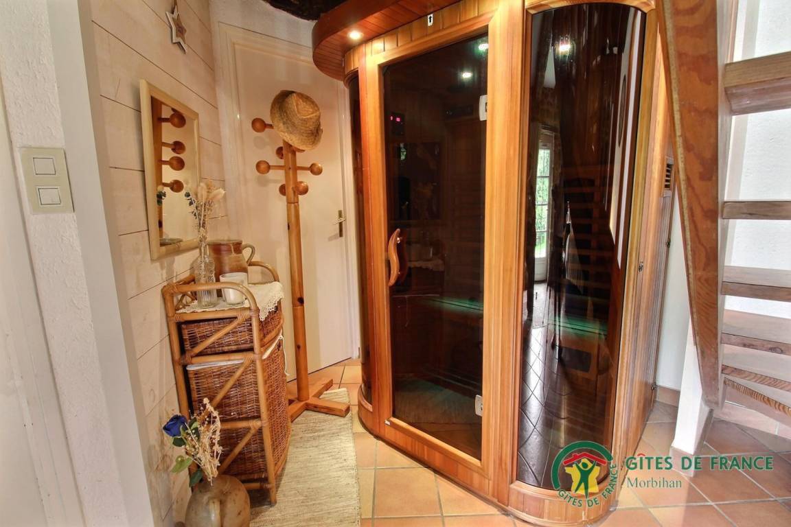 Im Erdgeschoss eine Einbauküche mit Wohnzimmer, Waschküche, ein großes Wohnzimmer mit Herd und eine Sauna für zwei Personen im Wohnzimmer. Ein Schlafzimmer für zwei Personen (140x190 Bett) mit Duschbad und separatem WC. Ein zweites Badezimmer mit WC.