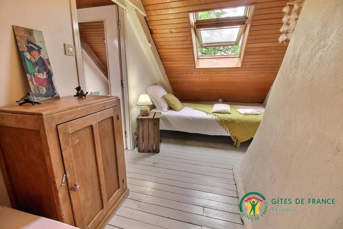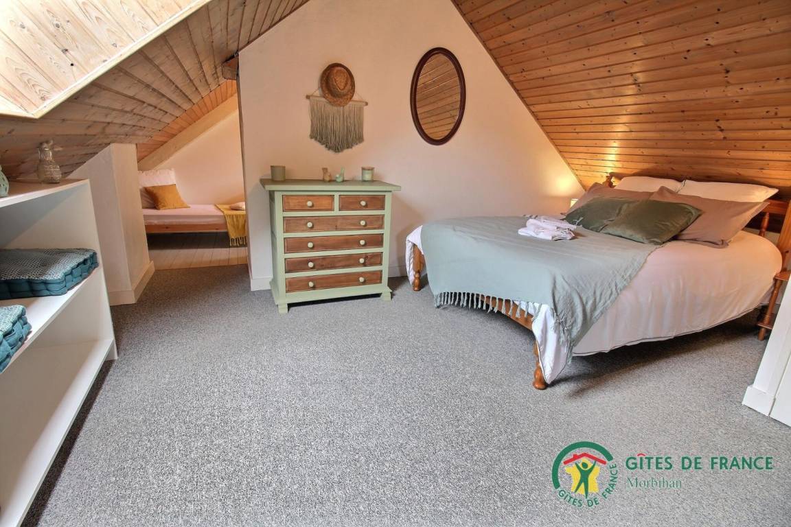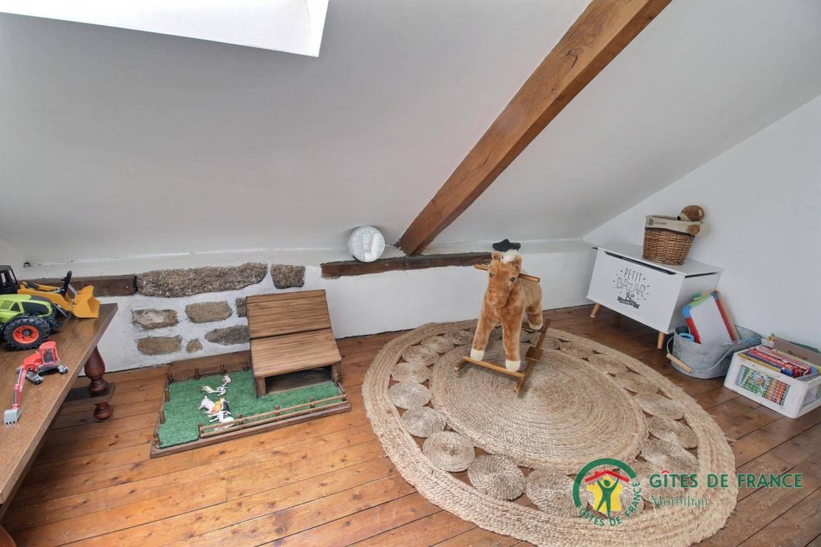 Im Obergeschoss befindet sich ein kleines Zwischengeschoss mit Kinderspielen, in dem sich ein Schlafzimmer für zwei Personen (Bett 140 x 190) befindet, ein Badezimmer mit WC und ein zweites Schlafzimmer für eine Person (Bett 90 x 190), das Zugang zum dritten Schlafzimmer für eine Person (90 x 190) bietet. Viertes Schlafzimmer im Obergeschoss, über eine weitere Treppe erreichbar, für zwei Personen (140x190 Bett).