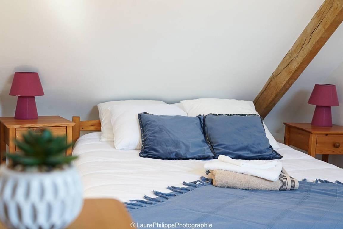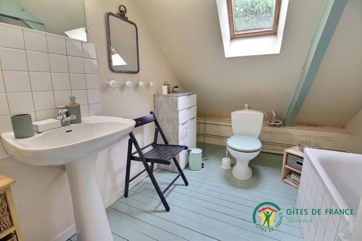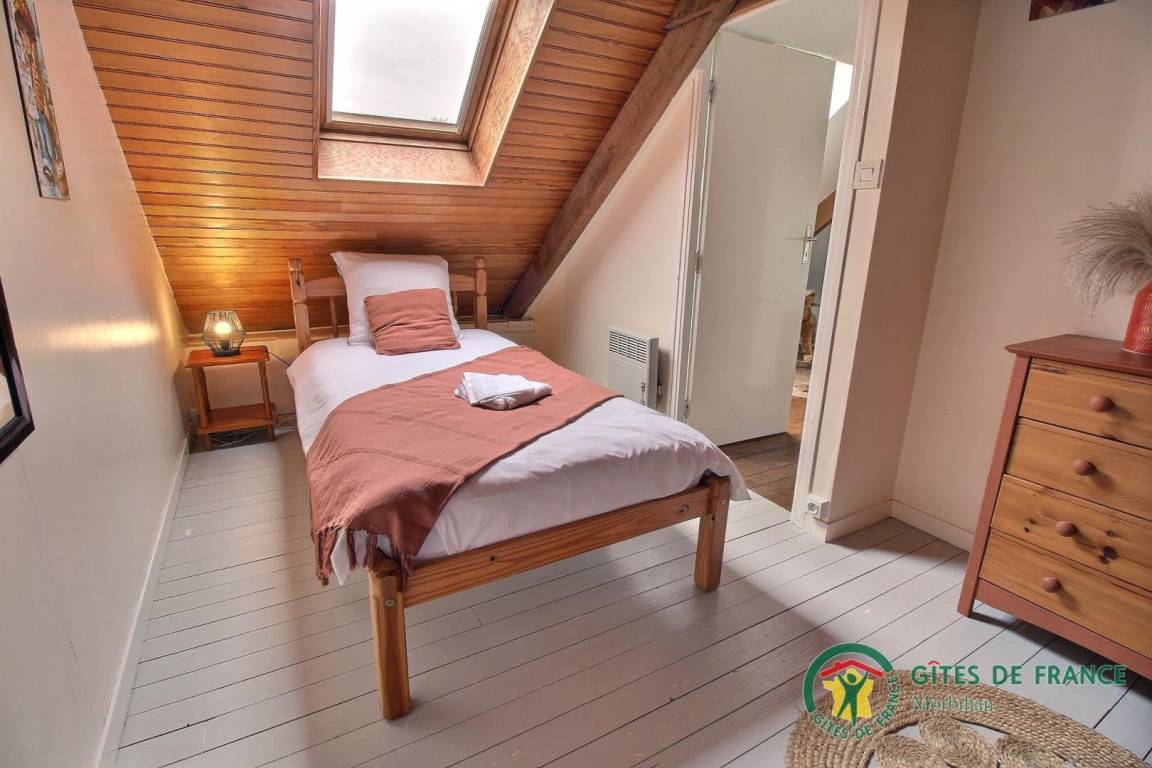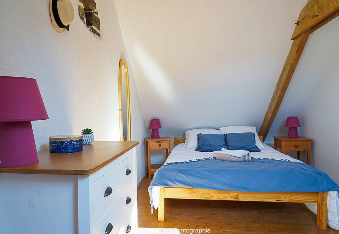 Im Obergeschoss befindet sich ein kleines Zwischengeschoss mit Kinderspielen, in dem sich ein Schlafzimmer für zwei Personen (Bett 140 x 190) befindet, ein Badezimmer mit WC und ein zweites Schlafzimmer für eine Person (Bett 90 x 190), das Zugang zum dritten Schlafzimmer für eine Person (90 x 190) bietet. Viertes Schlafzimmer im Obergeschoss, über eine weitere Treppe erreichbar, für zwei Personen (140x190 Bett).