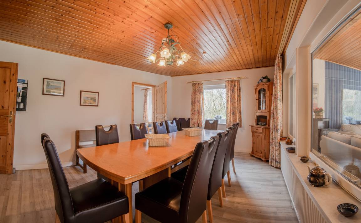 Das Haus ist für Rollstuhlfahrer geeignet. Im Erdgeschoss befinden sich 4 Schlafzimmer, ein Wohnzimmer, ein Frühstückszimmer, 2 Küchen, ein im Juni 2020 renoviertes Duschbad mit WC, Waschmaschine und Trockner sowie ein weiteres Duschbad mit WC. Im Souterrain ist ein weiteres im Juni 2020 renoviertes Schlafzimmer mit 2 Einzelbetten mit ebenfalls renovierter Dusche/WC sowie eine Sauna. Das Wohnzimmer verfügt über einen Kaminofen und hat Zugang zur überdachten Terrasse mit Grill und anschließender großer Rasenfläche.