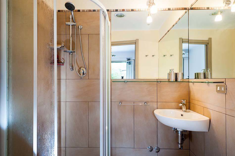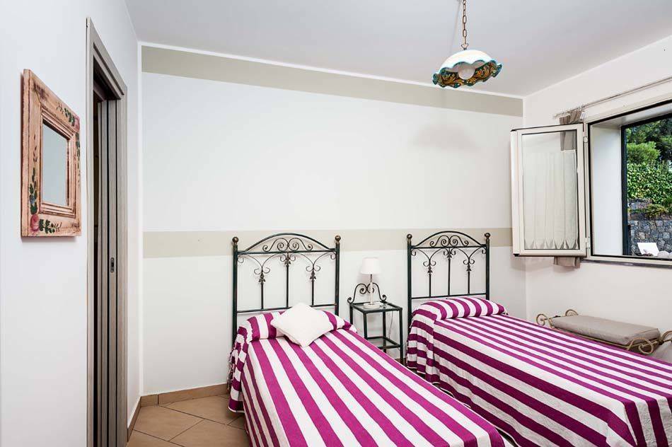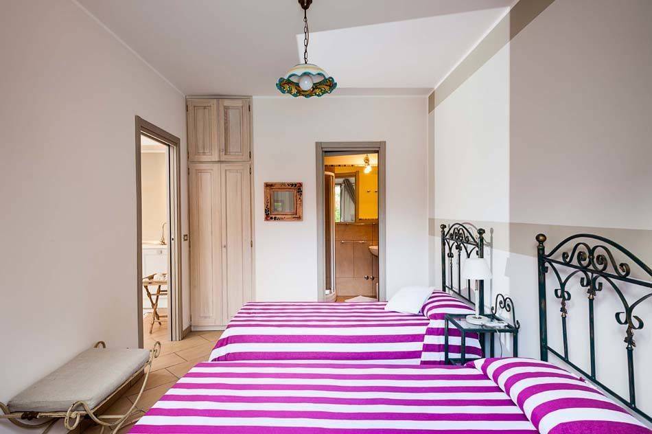 Schlafzimmer mit Bad 2: zwei Einzelbetten, Waschbecken, WC, Bidet, Dusche.