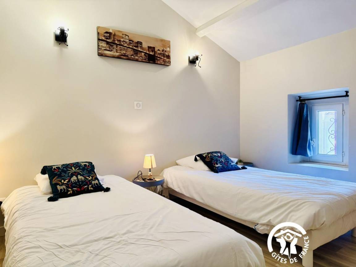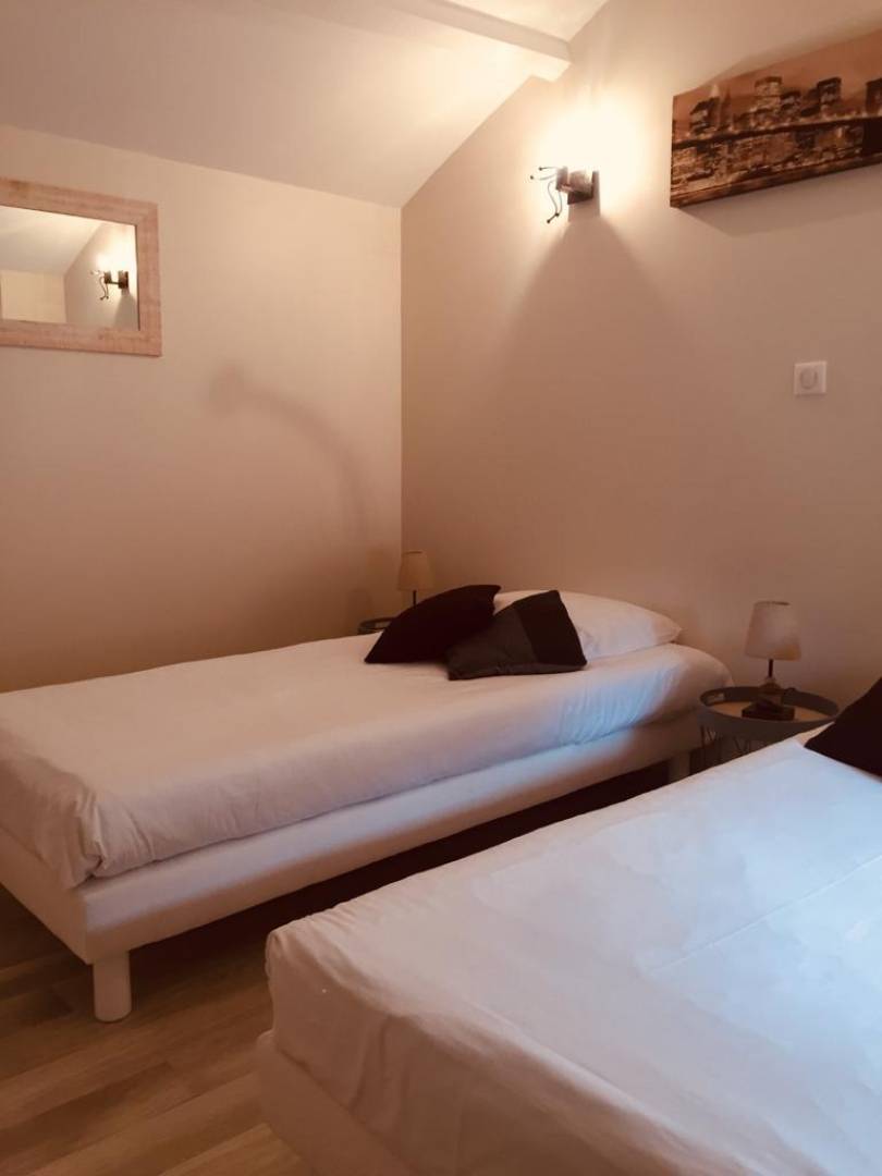Im Obergeschoss befindet sich ein Schlafzimmer mit zwei 90 cm breiten Betten im Dachgeschoss.