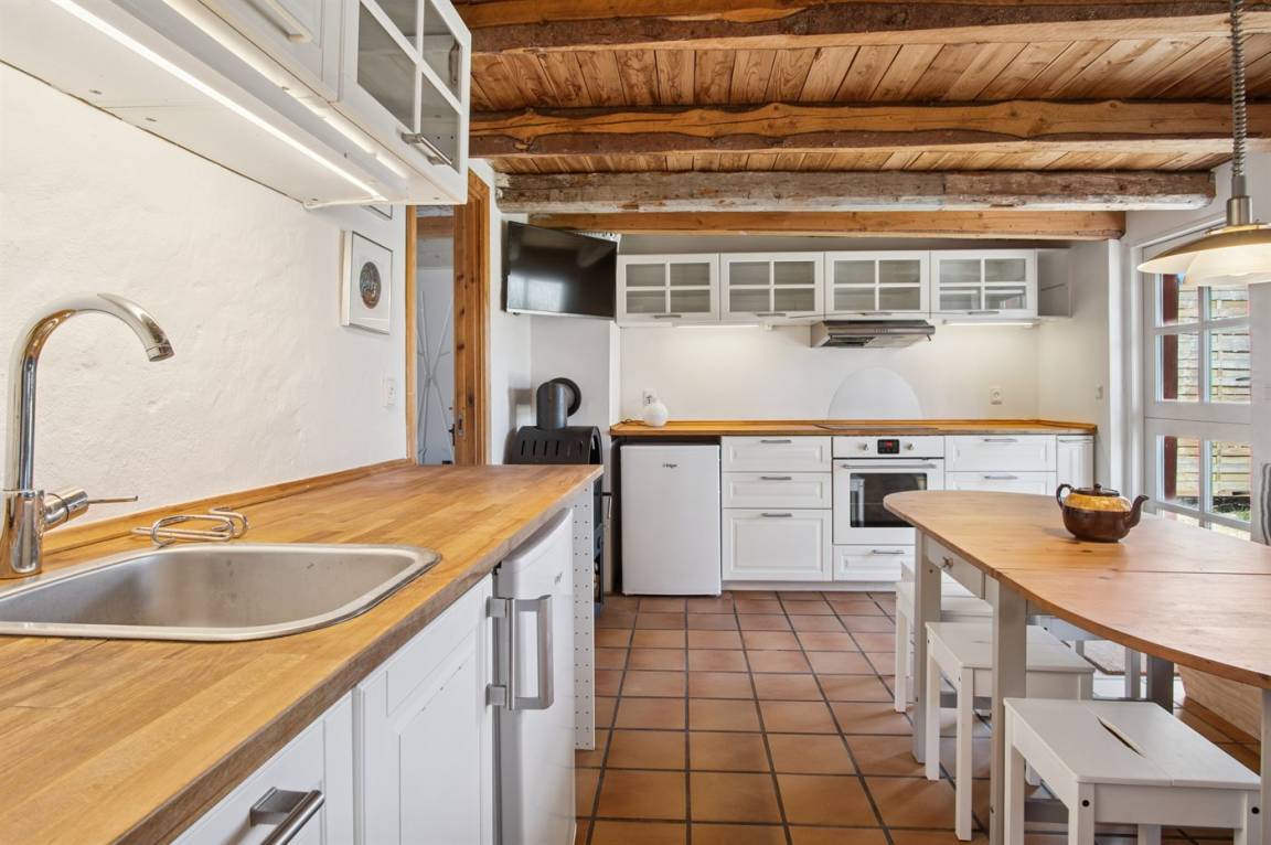 Älteres, historisches Haus, in dem die Wände Geschichten erzählen könnten. Die Küche und ihre Einrichtung sind in einem guten Zustand, aber nicht neu. Das Haus ist nicht so klinisch rein wie moderne Häuser, erzählt aber mit seinem Charme und Charakter eine unglaubliche Geschichte über das Leben.