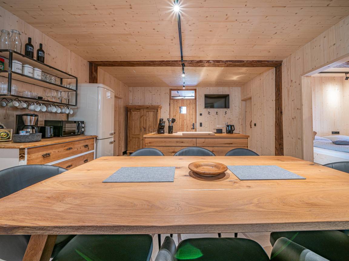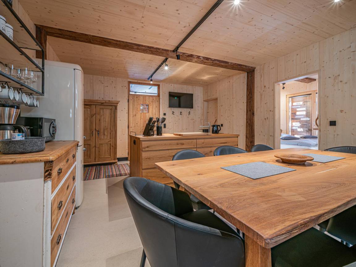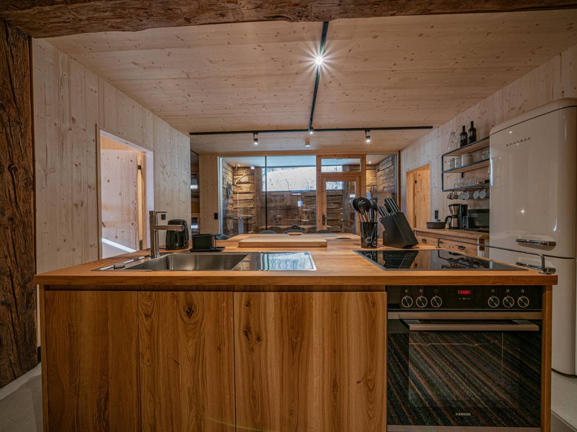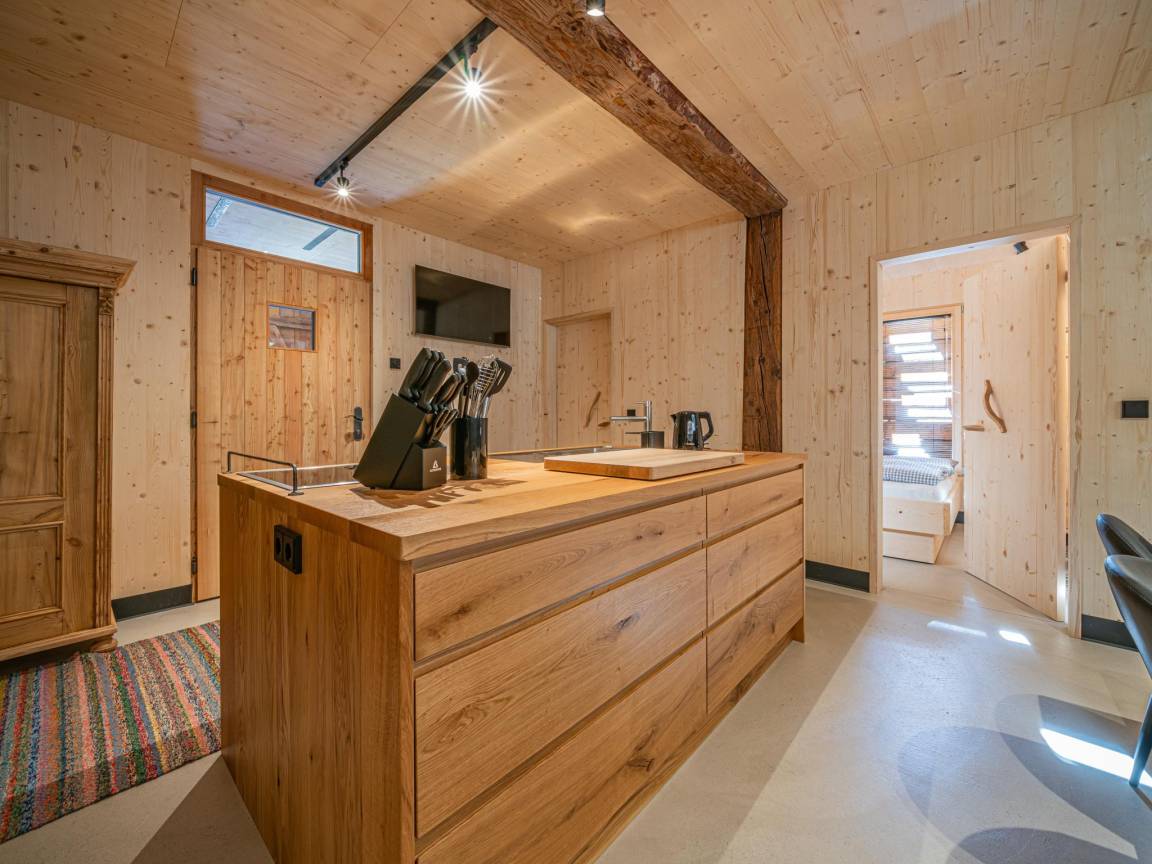 Hausbeschreibung : Dieses denkmalgeschützes Chalet verbindet moderne Wohnqualität mit alpinem Charme. Die offene Küche und der helle Wohnbereich mit TV schaffen eine warme, einladende Atmosphäre. Zwei Schlafzimmer mit Doppelbett sowie eine zusätzliche Schlafnische mit angeschlossener Empore bieten flexible Schlafmöglichkeiten – ideal für Familien. Terrasse und Balkon erweitern das Wohnerlebnis. Sauna und Waschmaschine stehen gemeinschaftlich zur Verfügung und erhöhen den Komfort