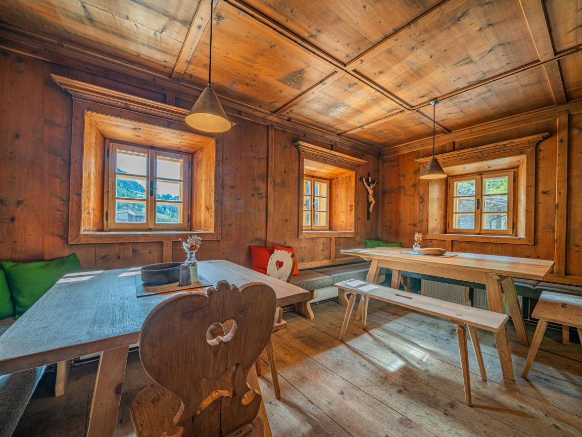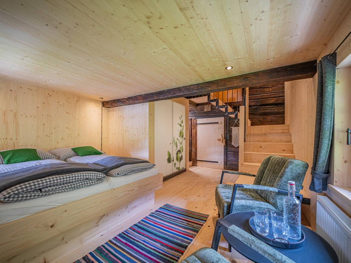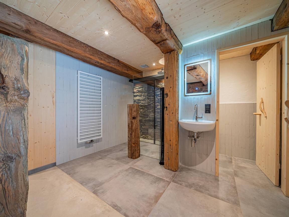 „Es handelte sich um einen fast 350 Jahre alten, denkmalgeschützten Bauernhof, der außerordentlich liebevoll und zu Ferienunterkünften umgestaltet wurde. Dabei wurden geschickt die modernen Ausstattungen und Gestaltungen mit den historischen Details und Bauteilen kombiniert. Wir wohnten im ehemaligen Hauptgebäude mit der alten Küche und mit der noch mit originaler Holzvertäfelung und Dielenboden versehenen Bauernstube. Praktisch war hier die Speisendurchreiche zur Küche. Der über die Zentralheizung angebundene alte Ofen machte die Stube sehr gemütlich. Im Erdgeschoss befand sich noch ein Rückzugs-Ruheraum mit 2 Relax-Liegen 2 Wirtschaftsräume mit Lager- und Abstellmöglichkeiten sowie mit Waschmaschine und einem zusätzlichen WC. Von außen ist nochmal sehr praktisch ein beheizter Raum für Ski-Schuhe und -sachen zugänglich. Im Obergeschoss befinden sich die Schlafräume, die jeweils über ein eigenes Bad mit Dusche und WC verfügen. Zwei Schlafräume sind mit einem Doppelbett jeweils unter einer Panoramaverglasung versehen. Die zwei anderen Schlafräume verfügen über eine 2. Ebene mit je zwei weiteren Betten somit über je 4 Betten. Wir haben wunderbar geschlafen und uns hier außerordentlich wohl gefühlt. In der ehemaligen benachbarten Scheune befindet sich eine weitere Ferienwohnung für insgesamt 8 Personen und noch eine Ferienwohnung für 2 Personen. (evtl. Kind auf Sofa). Diese Wohnungen konnten wir uns anschauen - sie wurden ebenfalls mit bester moderner Gestaltung und viel Liebe zum Detail in die historische Bausubstanz integriert. Hier wurde im Erdgeschoss der ehemaligen Scheune auch eine moderne Saunalandschaft eingebaut. Es gibt hier eine Finnische Sauna, 4 Ruheliegen, Dusche, WC und einen kleinen Außenbereich zum Abkühlen. Alles ist wiederum mit viel Glas, neuem und alten Holz wunderbar in die alte Scheune integriert. Das Ensemble wird vervollständigt von einem großen Carport für 5 PKW, angebautem Skiraum sowie weiteren PKW-Stellplätzen. Für den Sommer gibt es auch außen schöne Terrassen mit Sitzmöglichkeiten. Die Übergabe mit dem Vermieter verlief sehr nett und völlig unproblematisch. Die Kommunikation verlief unproblematisch über Telefon und WhatsApp. Da wir über Silvester da waren, stellte er uns auch eine Möglichkeit und Brennholz für ein Lagerfeuer sowie eine Partybox zur Verfügung.“