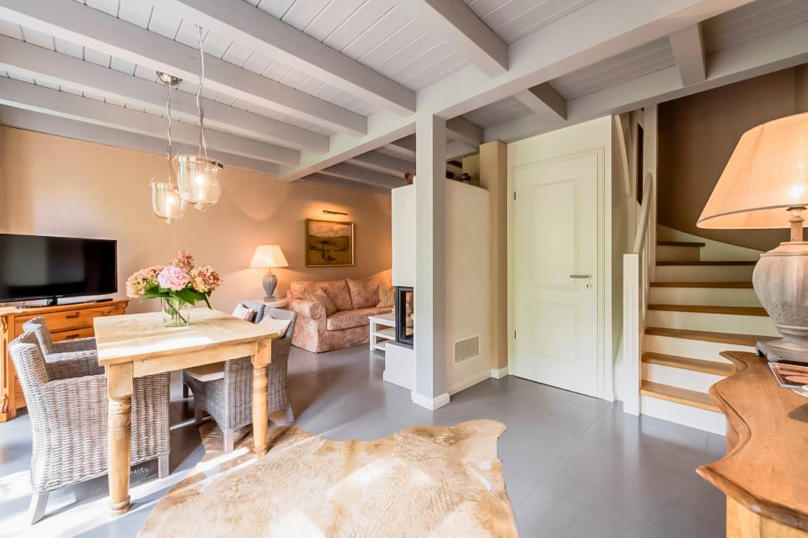 Wohnzimmer mit Kamin und gemütlicher Sitzgarnitur