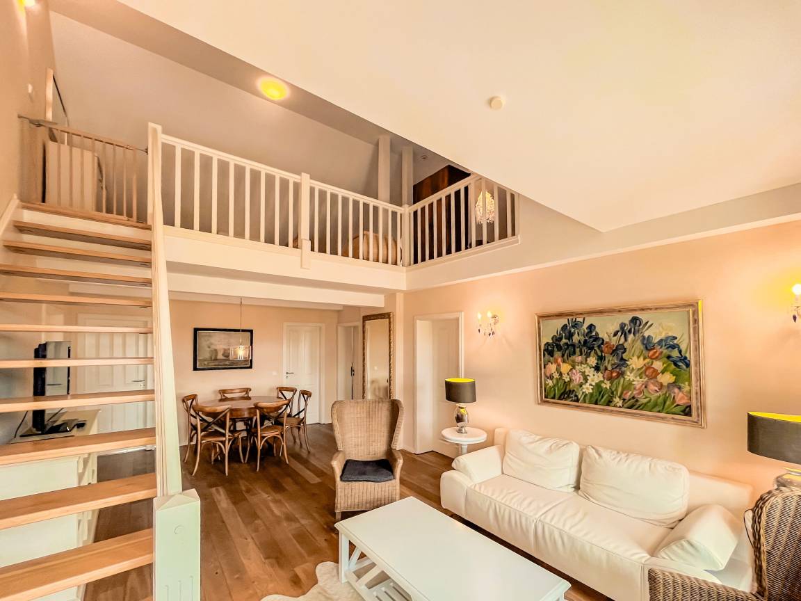 Offene Schlafgalerie mit einem weiteren Doppelbett, erreichbar über eine Treppe innerhalb der Wohnung