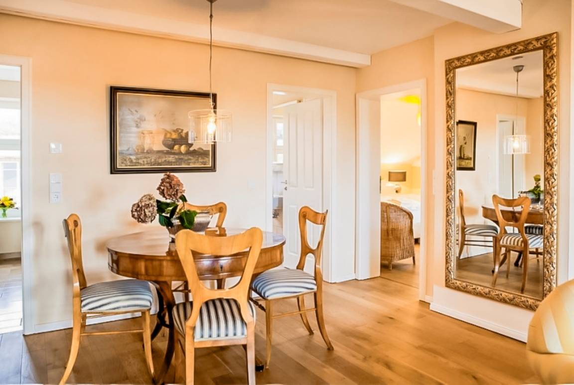 Die Einrichtung im Landhausstil, kombiniert mit hochwertigen Materialien wie Eichenböden und Fußbodenheizung, schafft ein behagliches Ambiente.