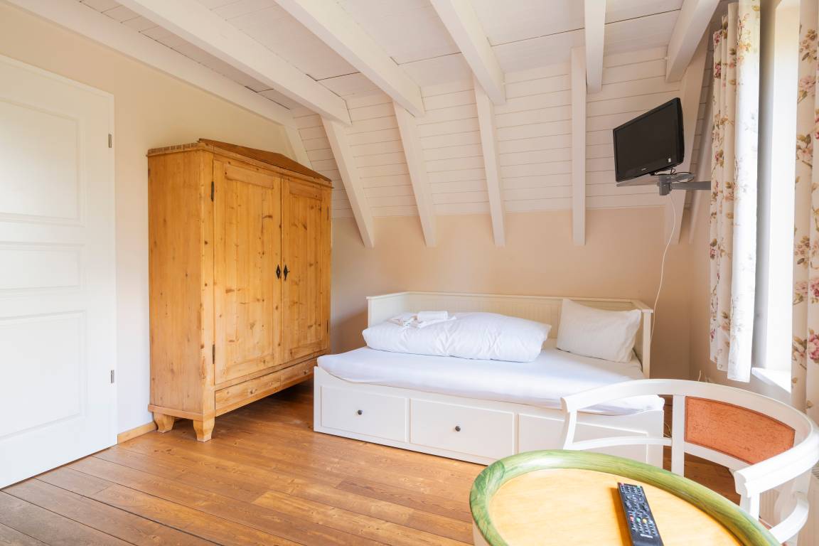 Spitzboden: Über ein Schlafzimmer über eine Treppe erreichbar (nicht barrierefrei), mit Doppelbett und Schlafcouch – ideal für zusätzliche Gäste