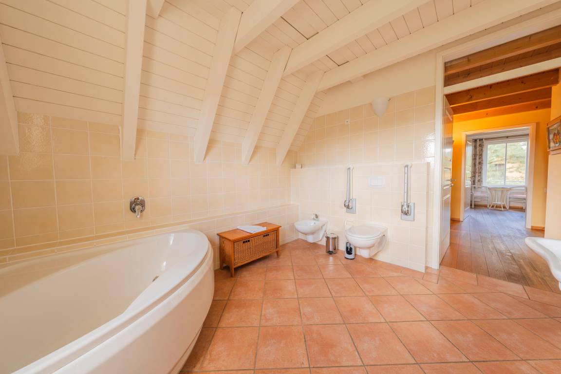 Geräumiges Badezimmer:[nbsp] Mit Eckbadewanne, Dusche, WC und Bidet