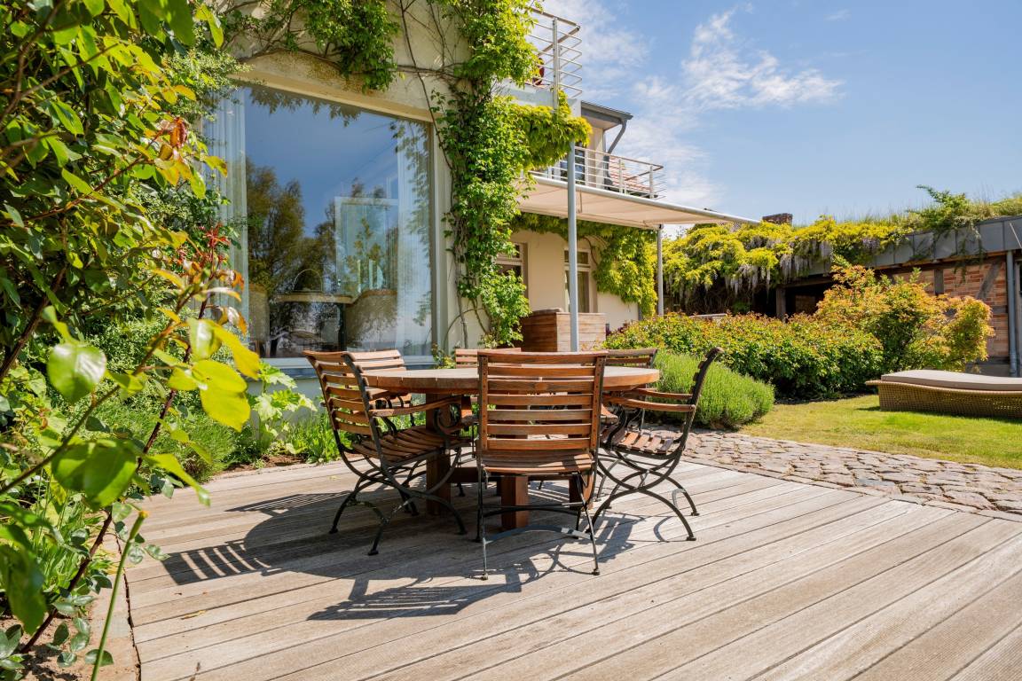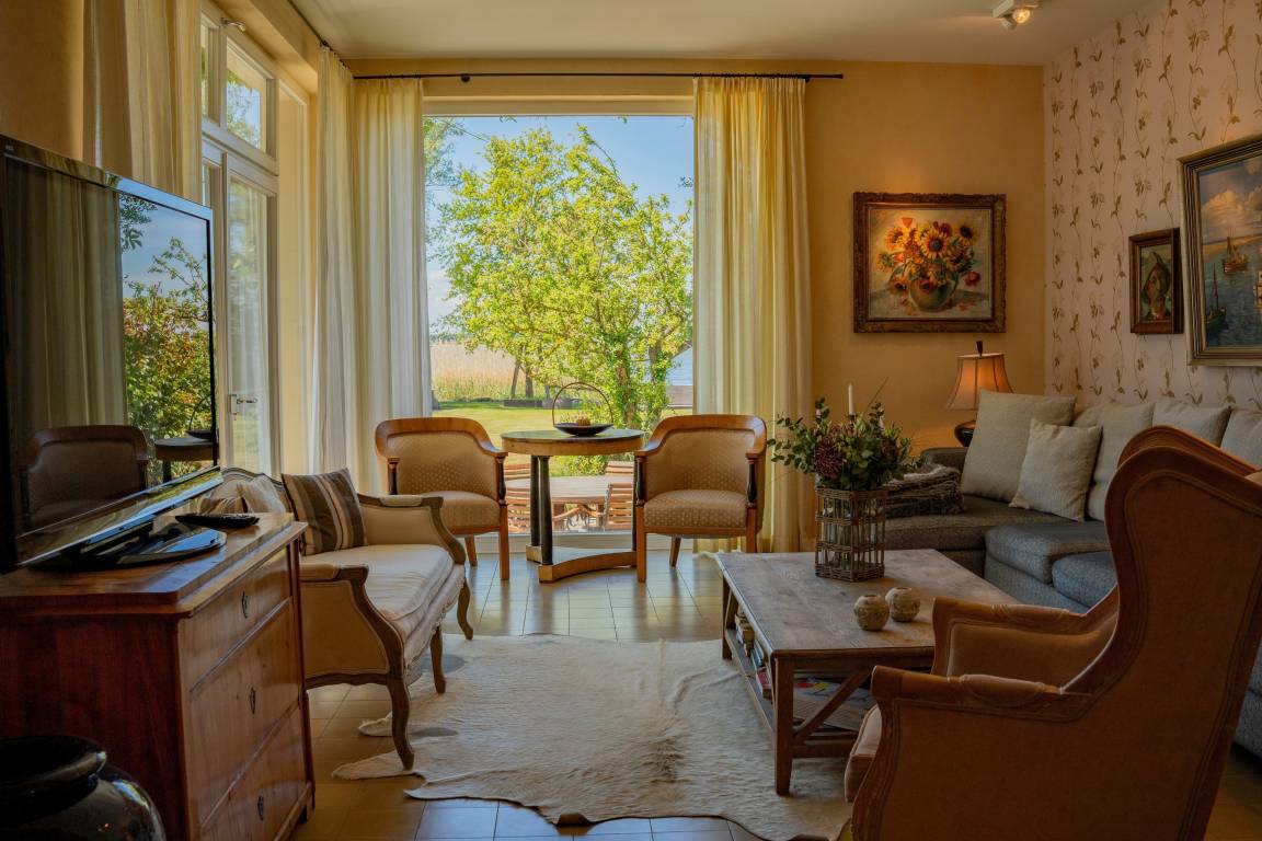 Terrassen und Sitzbereiche: Verschiedene Sitzmöglichkeiten auf der Terrasse, der Liegewiese oder direkt am Wasser bieten Raum für entspannte Stunden. Ein Feuerkorb am Wasser lädt zu stimmungsvollen Abenden ein.