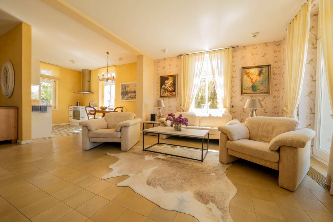 2 großzügige Wohnbereiche mit gemütlicher Sitzgarnitur, TV-Flatscreen und Kamin