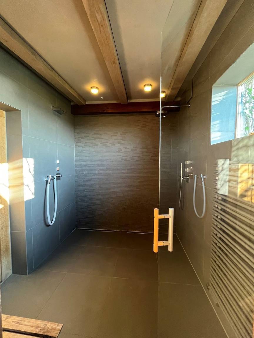 2 luxuriöse Bäder mit Eckbadewanne bzw. Badewanne, Dusche, WC, Waschmaschine und Trockner