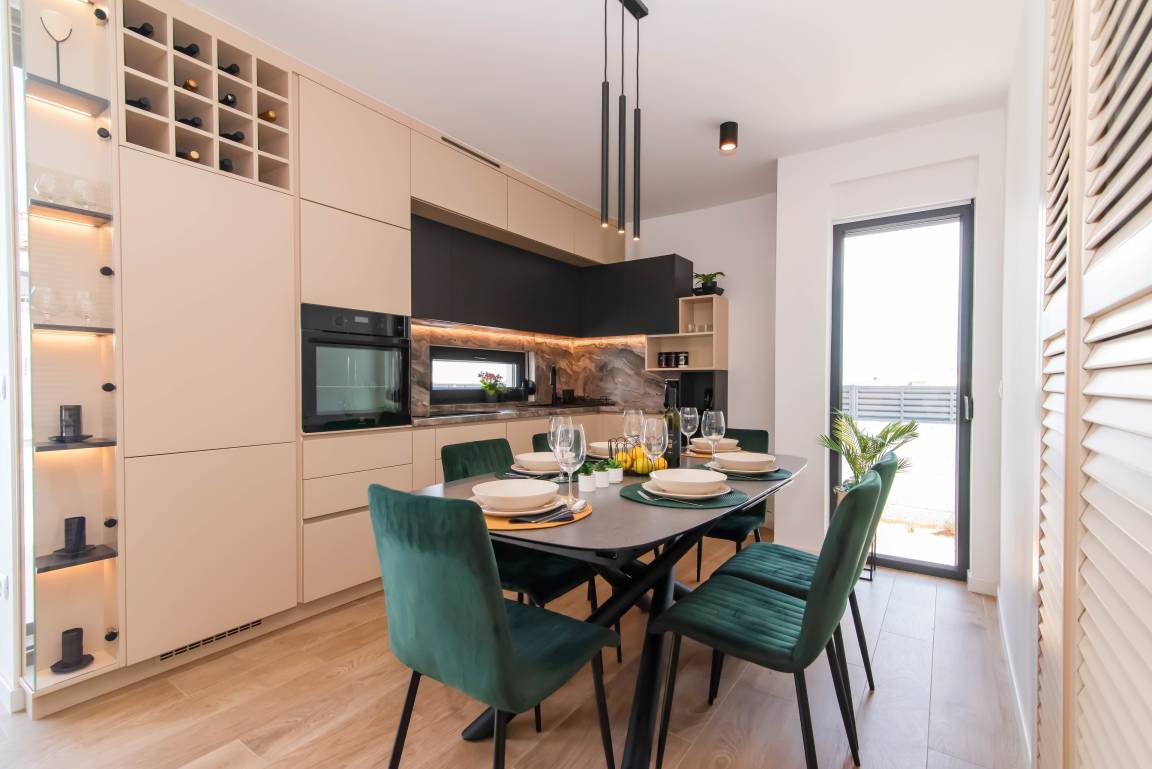 The fully equipped kitchen features modern appliances and ample space for culinary adventures, while the dining area sets the stage for enjoying meals with loved ones.