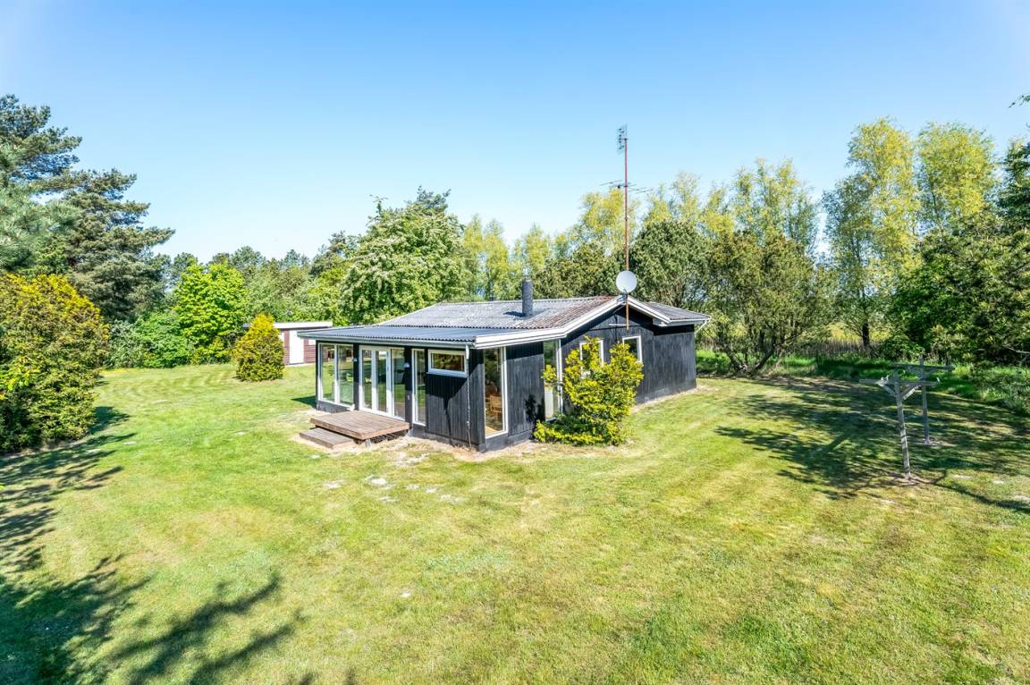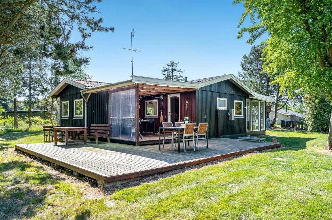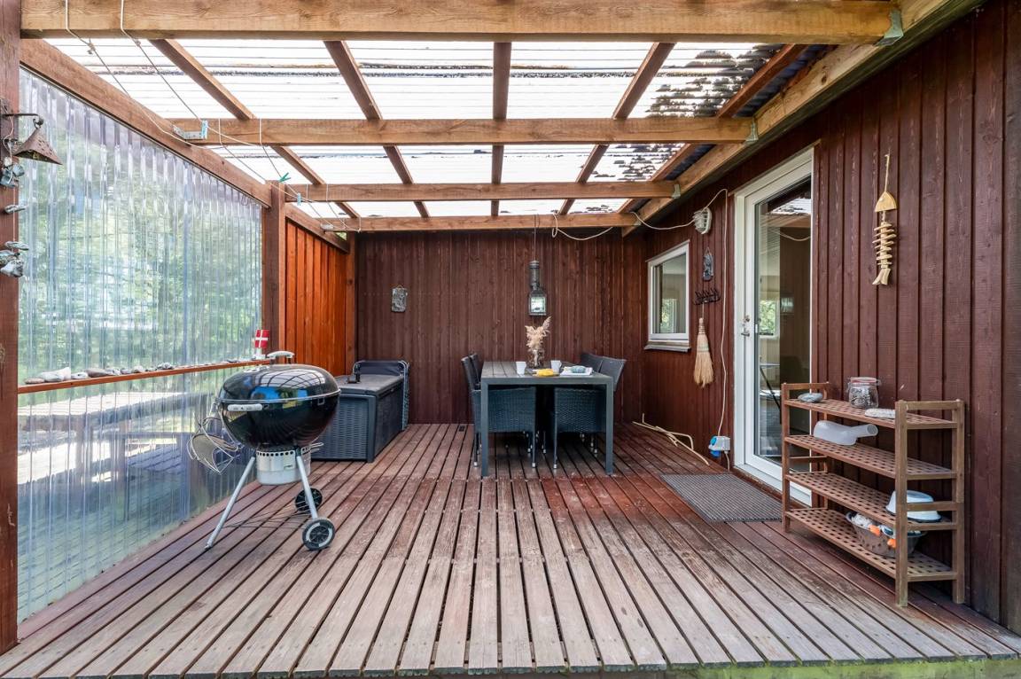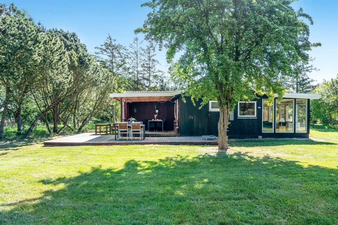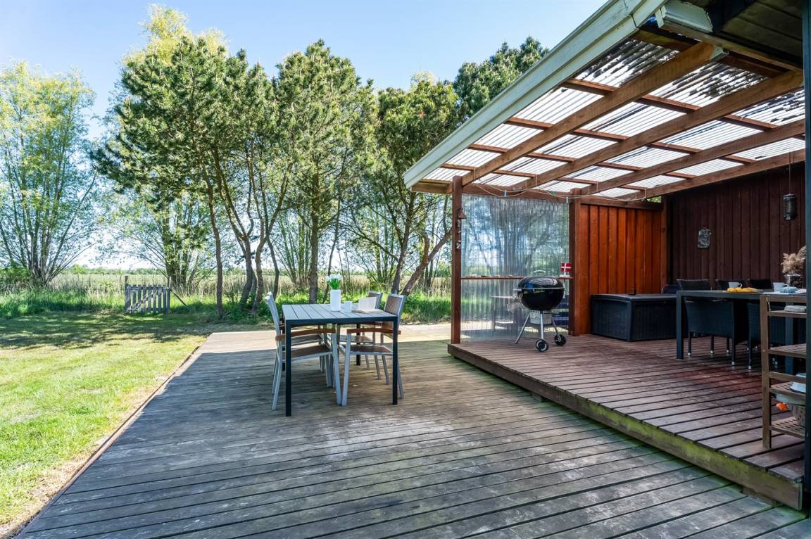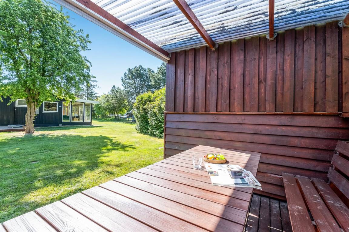 Dieses geräumige Ferienhaus liegt in ruhiger und naturschöner Umgebung, auf einem von Büschen und Bäumen umgebenen Grundstück mit Platz für Ballspiele und andere Aktivitäten im Freien. Zum Haus gerhört eine schöne, teilweise überdachte Terrasse – hier können Sie viele entspannende Stunden verbringen.